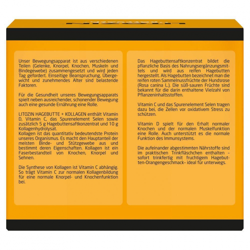 Пищевая добавка LITOZIN® Hagebutte + Kollagen в форме питьевых флаконов содержит коллагеновый гидролизат, концентрат сока шиповника, витамины C и D, селен. Способствует здоровью суставов, костей и соединительной ткани, защищает клетки от окислительного стресса, поддерживает иммунную систему. Готовый к употреблению напиток с фруктовым вкусом шиповника и апельсина.