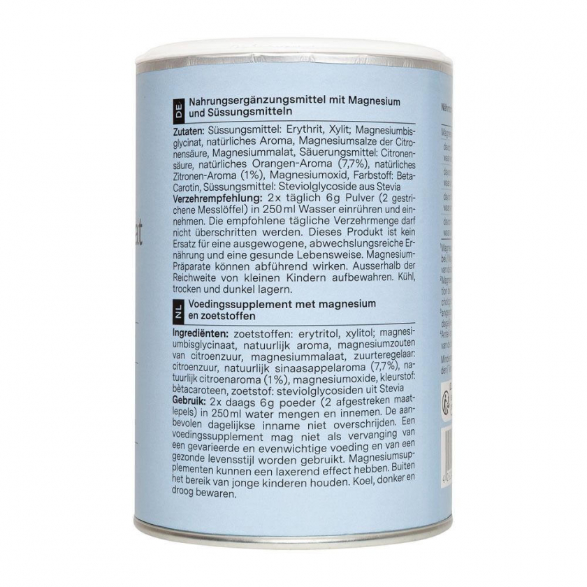 Состав: Подсластители: эритрит, ксилит; магнийбисглицинат, натуральный ароматизатор, соли магния лимонной кислоты, магния малат, подкислитель: лимонная кислота, натуральный апельсиновый ароматизатор (7,7%), натуральный лимонный ароматизатор (1%), оксид магния, краситель: бета-каротин, подсластитель: стевиолгликозиды из стевии