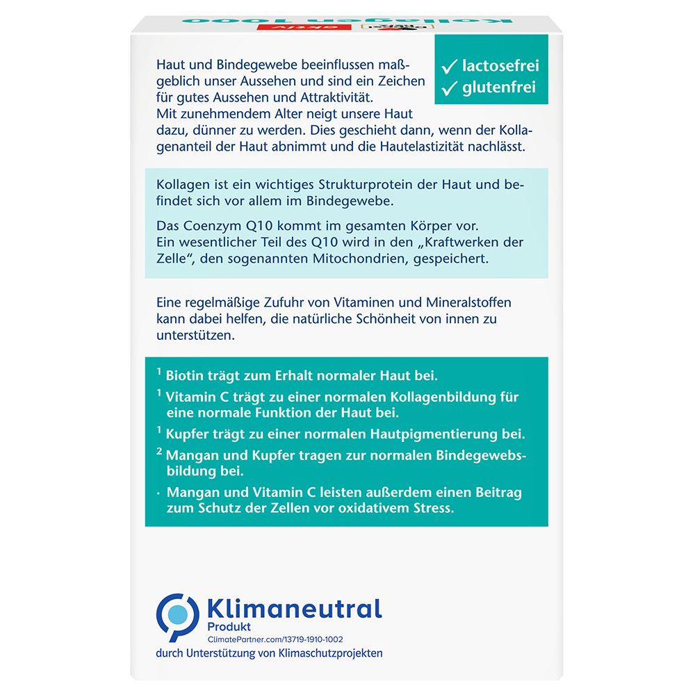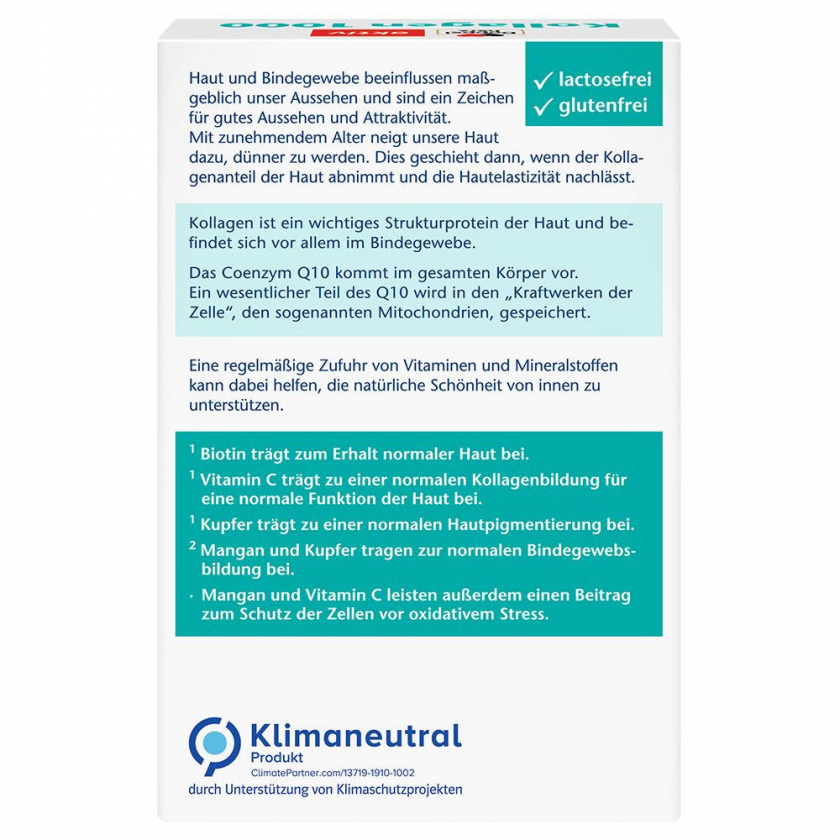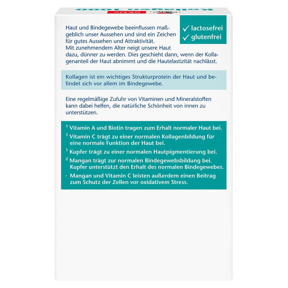 Биологически активная добавка Doppelherz® aktiv Kollagen 1000 + Biotin + Q10 содержит 1000 мг коллагенгидролизата, биотин, витамин C, коэнзим Q10, медь и марганец для поддержания здоровья кожи и соединительной ткани. Способствует нормальному образованию коллагена, поддержанию нормального состояния кожи и защите клеток от окислительного стресса.