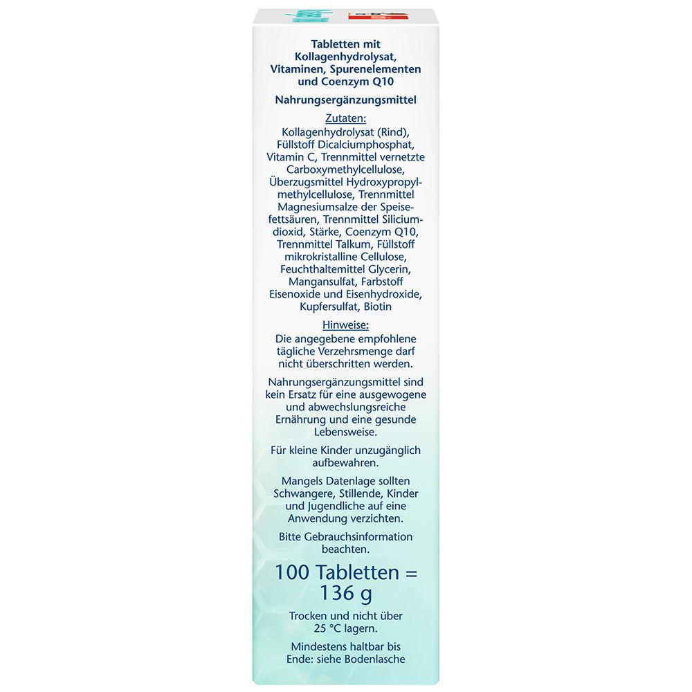 Коллагенгидролизат (говядина), наполнитель дикальцийфосфат, витамин C, разделитель сшитая карбоксиметилцеллюлоза, покрывающее средство гидроксипропилметилцеллюлоза, разделитель соли магния пищевых жирных кислот, разделитель диоксид кремния, крахмал, коэнзим Q10, разделитель тальк, наполнитель микрокристаллическая целлюлоза, увлажнитель глицерин, сульфат марганца, краситель оксиды и гидроксиды железа, сульфат меди, биотин