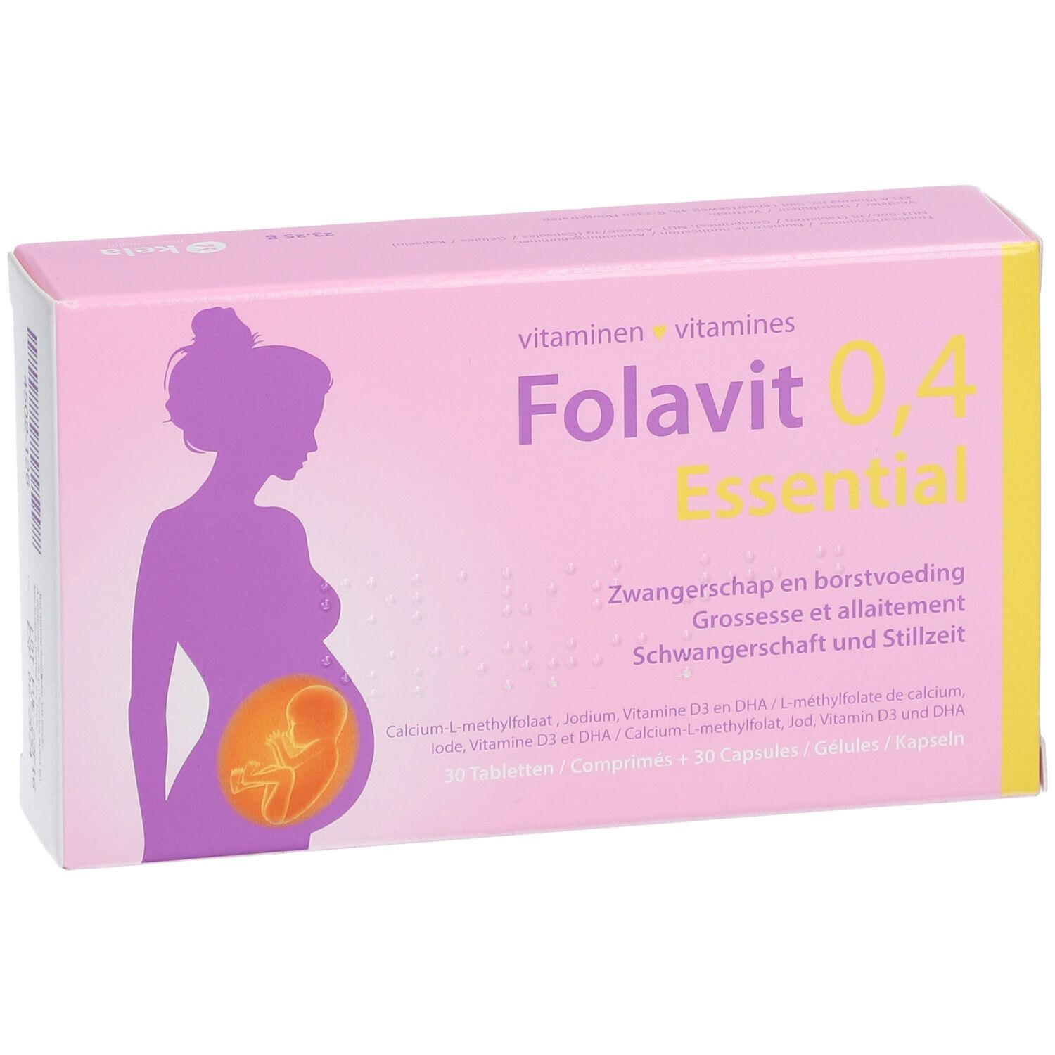 Пищевая добавка Folavit 0.4 Essential специально разработана для беременных и кормящих женщин. Содержит активную форму фолата (400 мкг фолиевой кислоты), йод, витамин D3 и DHA из водорослей. Подходит для вегетарианцев и веганов. Рекомендуется принимать за месяц до зачатия и в первые три месяца беременности для профилактики дефектов нервной трубки.