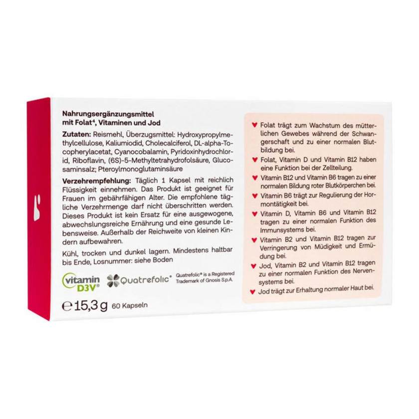 Пищевая добавка для женщин, планирующих беременность. Содержит комплекс витаминов, йод и активную форму фолата Quatrefolic® для оптимальной подготовки организма к беременности. Способствует нормальному росту тканей, кроветворению и снижает риск дефектов нервной трубки у плода.