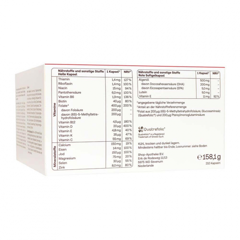 Состав: Светлая капсула: оксид кальция, оксид магния, гидроксипропилметилцеллюлоза (оболочка), L-аскорбиновая кислота, порошок среднецепочечных жирных кислот из кокоса, фумарат железа, никотинамид, D-альфа-токоферилацетат, холекальциферол, оксид цинка, пантотенат кальция, селенит натрия, менахинон-7, гидрохлорид пиридоксина, тиаминмононитрат, йодид калия, рибофлавин, цианокобаламин, (6S)-5-метилтетрагидрофолиевая кислота, глюкозаминовая соль; птероилмоноглутаминовая кислота, D-биотин. Красная софтгель-капсула: масло из микроводорослей Schizochytrium sp., богатое DHA и EPA (Индия), глицерин, кукурузный крахмал, лютеин, каррагинан, моно- и диглицериды пищевых жирных кислот, D-альфа-токоферол, оксиды и гидроксиды железа