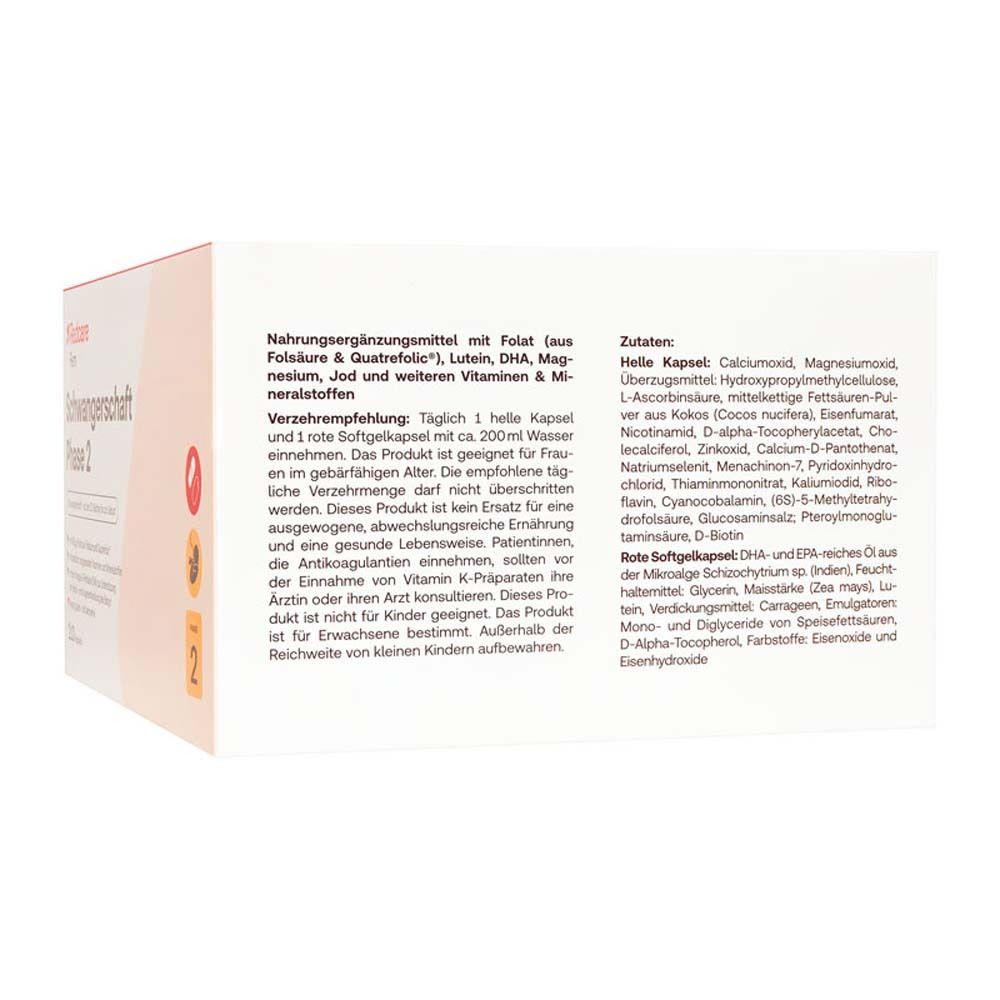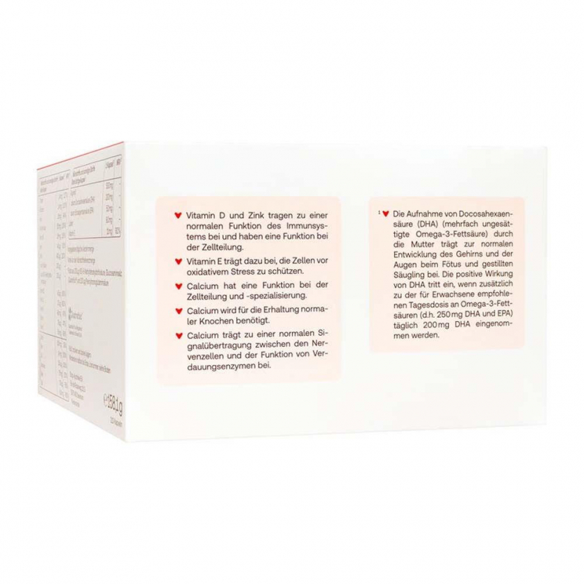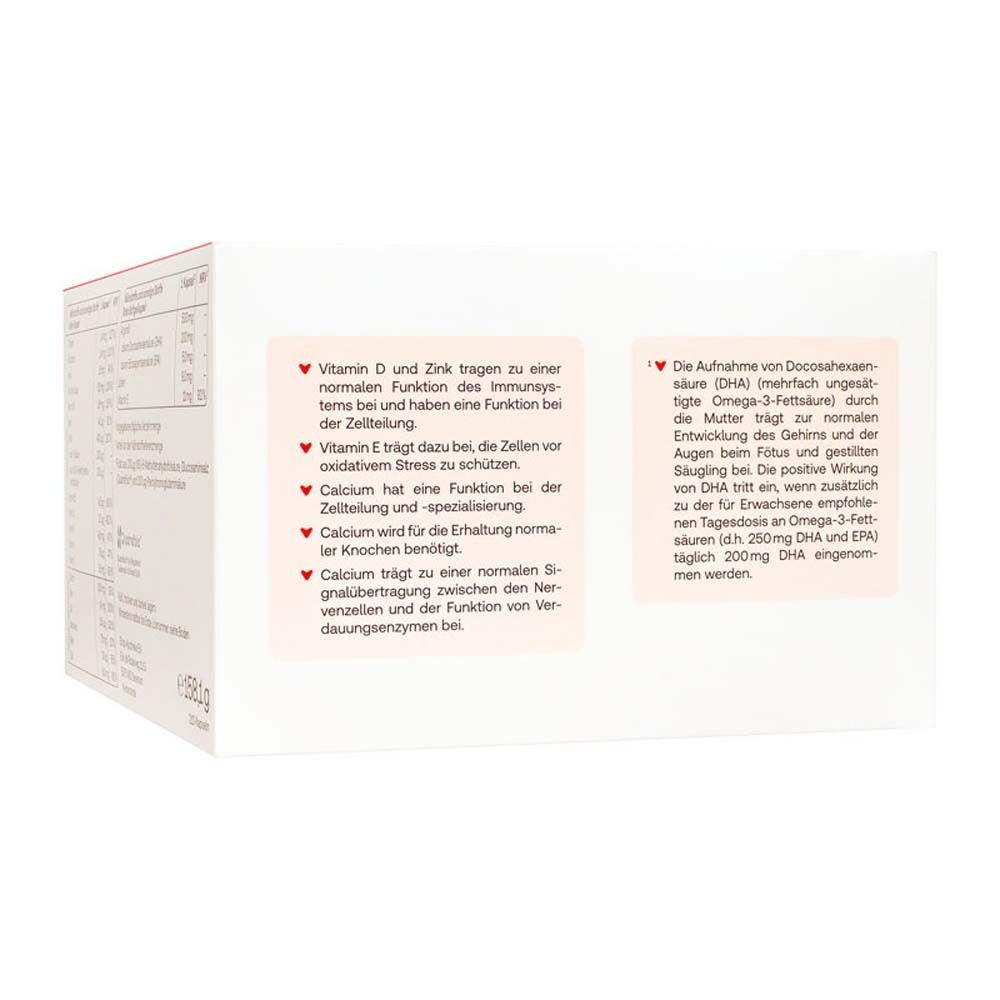 Витаминно-минеральный комплекс для беременных женщин с 13-й недели беременности. Содержит фолат в активной форме Quatrefolic®, витамины группы B, C, D, E, K, минералы (кальций, железо, селен, йод, магний) и омега-3 жирные кислоты из водорослей. Способствует нормальному развитию мозга и глаз плода, поддержанию иммунитета и костной системы.