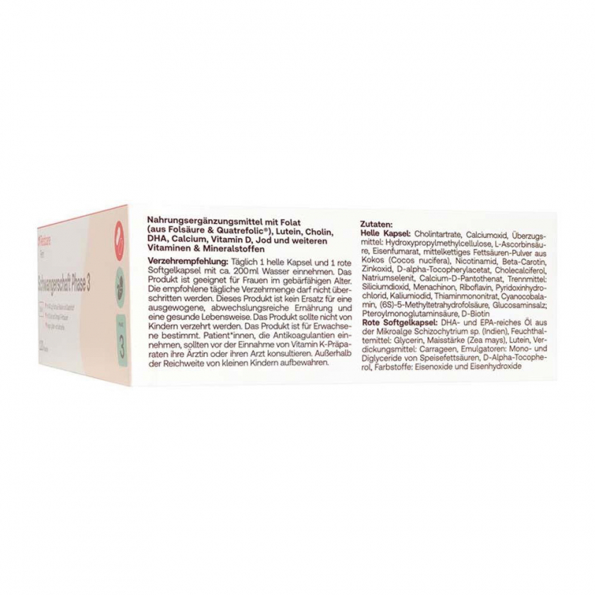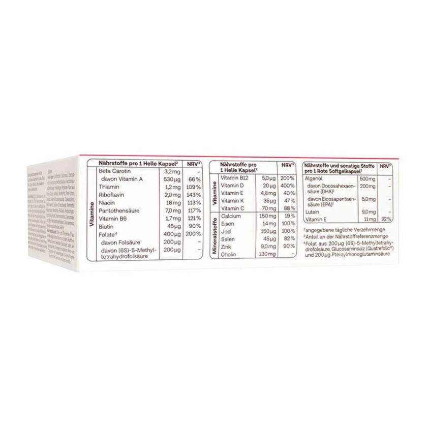 Состав: Светлая капсула: холинтартрат, оксид кальция, гидроксипропилметилцеллюлоза (оболочка), L-аскорбиновая кислота, фумарат железа, порошок среднецепочечных жирных кислот из кокоса, никотинамид, бета-каротин, оксид цинка, D-альфа-токоферола ацетат, холекальциферол, селенит натрия, пантотенат кальция, диоксид кремния, менахинон, рибофлавин, гидрохлорид пиридоксина, йодид калия, тиаминмононитрат, цианокобаламин, (6S)-5-метилтетрагидрофолиевая кислота, глюкозаминовая соль; птероилмоноглутаминовая кислота, D-биотин. Красная мягкая капсула: масло микроводорослей Schizochytrium sp., богатое DHA и EPA, глицерин, кукурузный крахмал, лютеин, каррагинан, моно- и диглицериды жирных кислот, D-альфа-токоферол, оксиды и гидроксиды железа