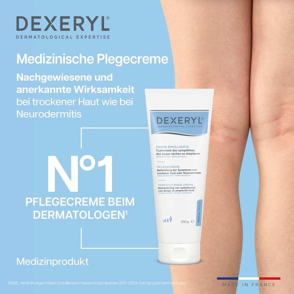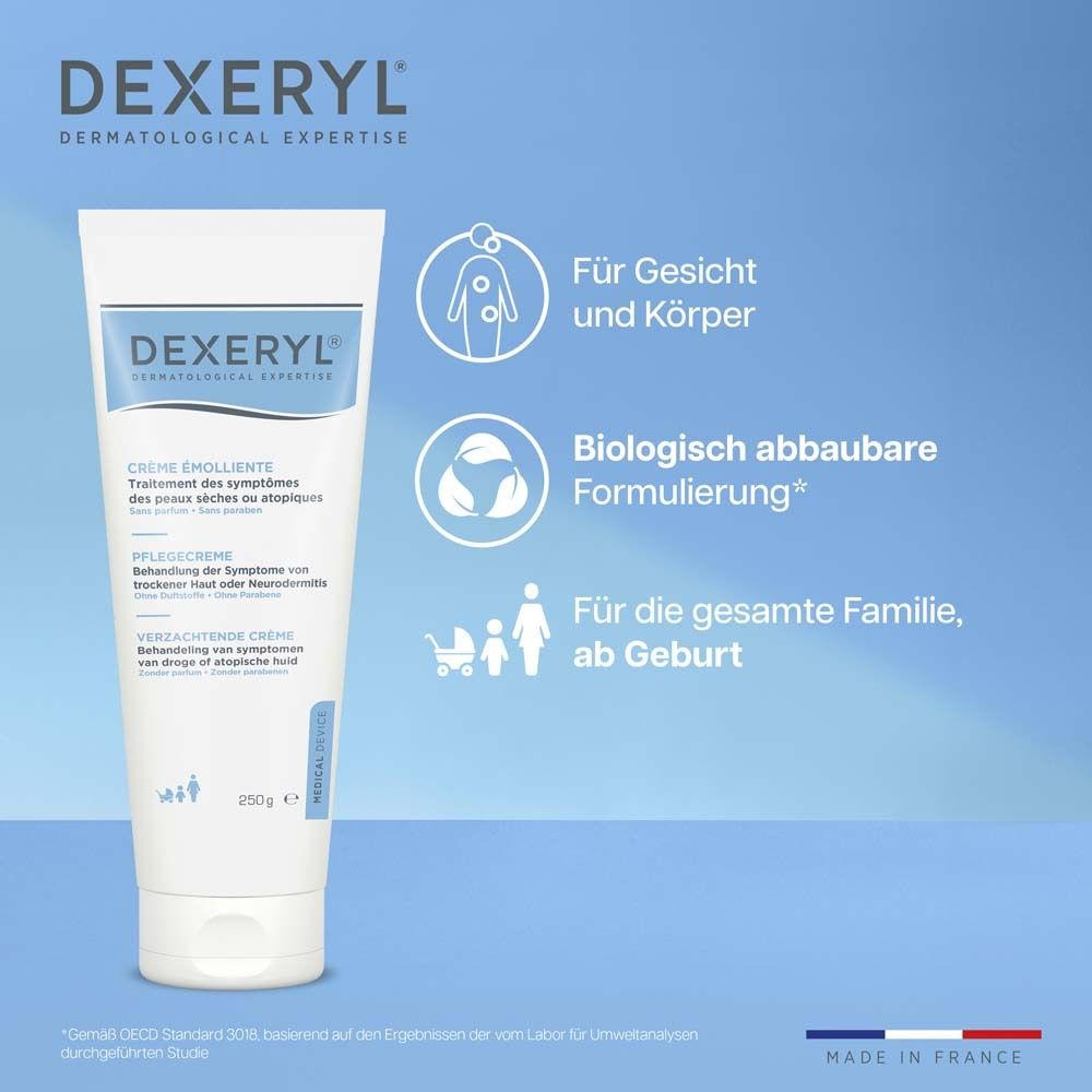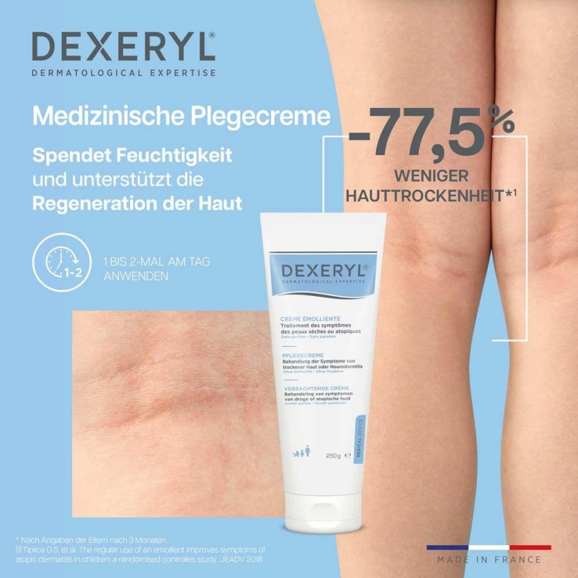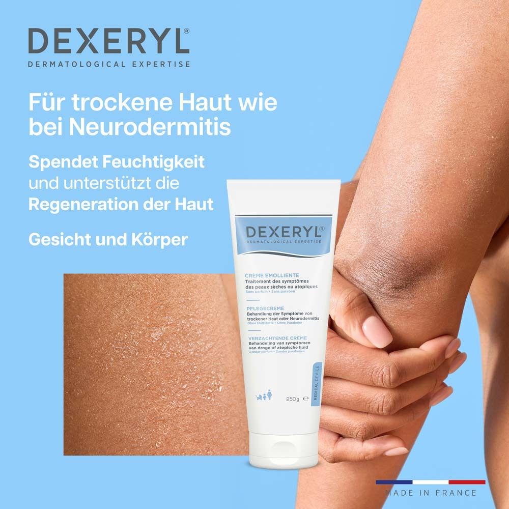 Медицинская увлажняющая крем-эмолент DEXERYL для интенсивного ухода за сухой кожей при нейродермите, ихтиозе и диабетической сухости. Без отдушек, парабенов и раздражителей, подходит для всей семьи с рождения. Восстанавливает кожный барьер, увлажняет до 12 часов, снимает зуд.