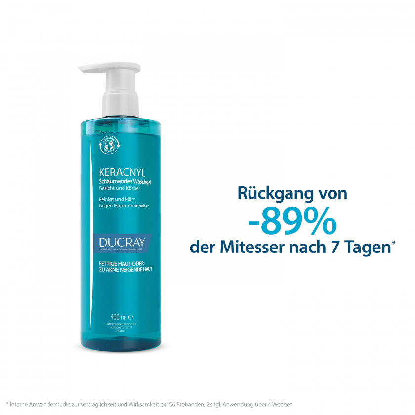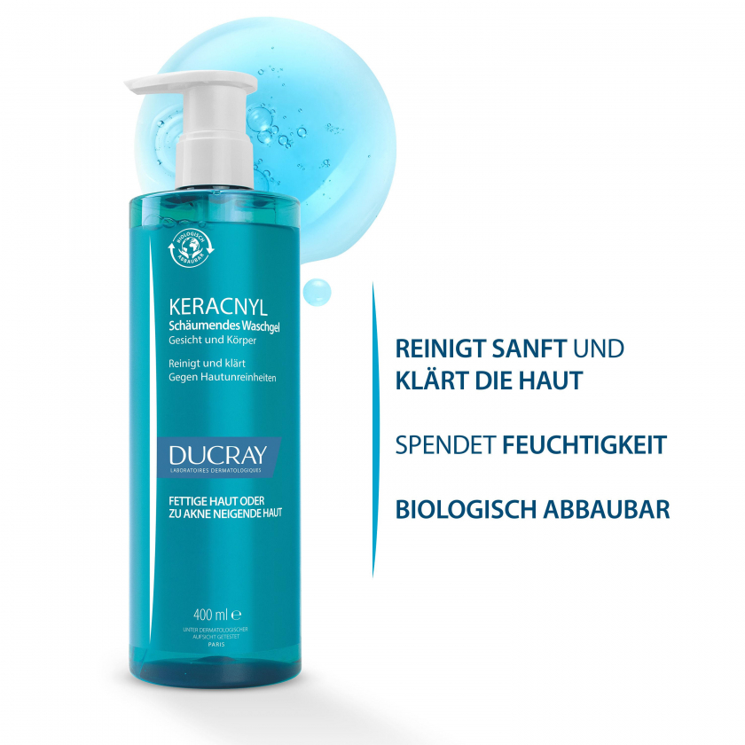 DUCRAY KERACNYL Waschgel - мягкое очищающее средство для проблемной кожи, склонной к акне и прыщам. Содержит инновационный активный компонент Myrtacin®, который разрушает и предотвращает образование бактериального биопленка. Подходит для лица и тела, не содержит мыла, увлажняет кожу и восстанавливает кожный барьер. Может использоваться как самостоятельно, так и в комбинации с другими средствами от акне.