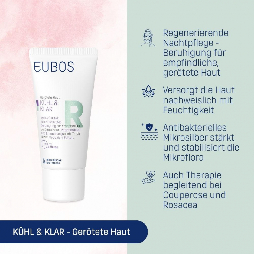 Интенсивный крем EUBOS KÜHL & KLAR ANTI-RÖTUNG для ухода за кожей при розацеа и куперозе. Содержит антибактериальное микросеребро, фито-активный комплекс с бессмертником итальянским и увлажняющий комплекс Hydra Synol®. Уменьшает покраснения, укрепляет сосуды, восстанавливает кожу ночью. Объем 30 мл.