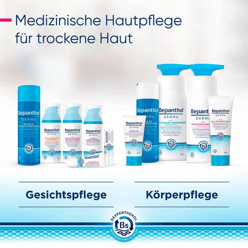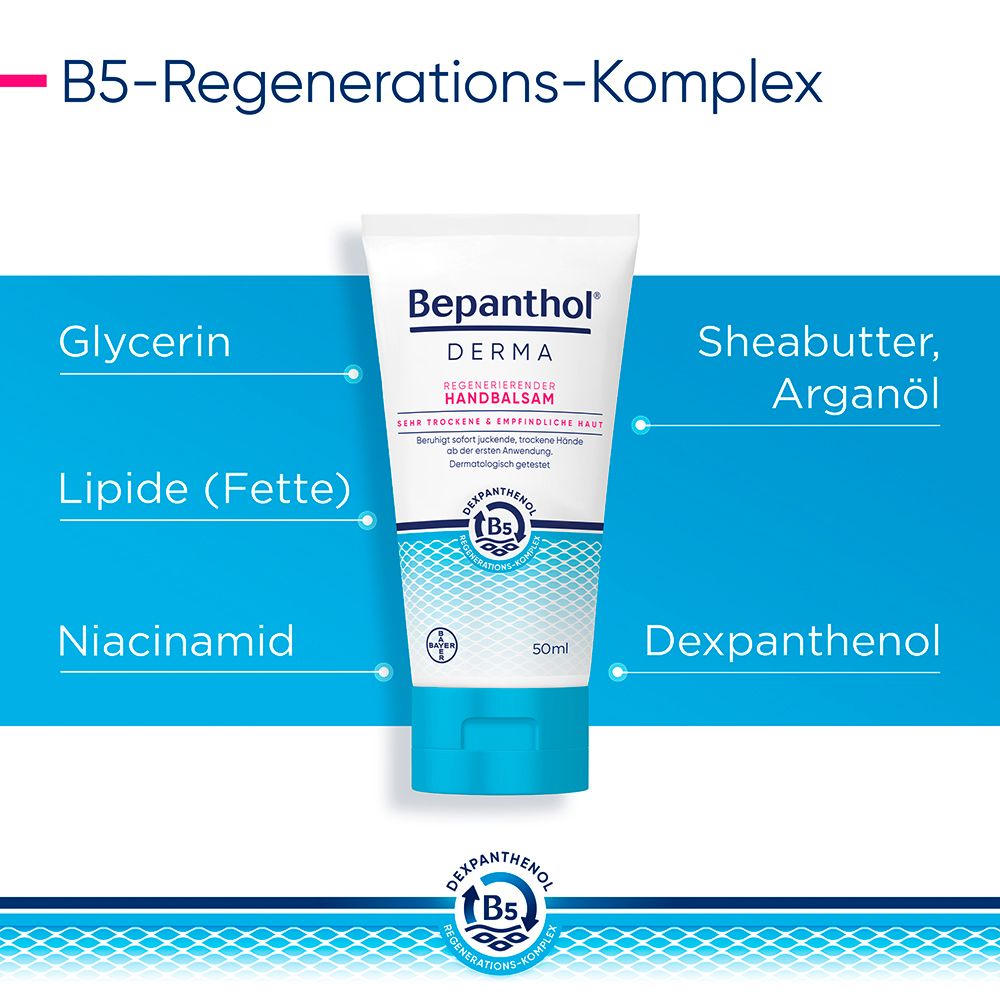 Bepanthol® DERMA Regenerierender Handbalsam für die tägliche Pflege, beruhigt sofort juckende, trockene Hände, zieht schnell ein und spendet bis zu 48h Feuchtigkeit. Mit B5-Regenerations-Komplex