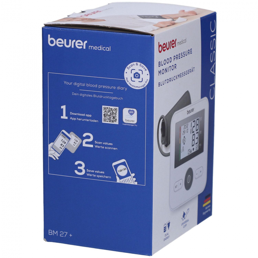 Цифровой тонометр Beurer BM 27 для измерения артериального давления на плече с клинической валидацией. Имеет 4 пользовательских профиля с памятью на 30 измерений каждый, функцию распознавания аритмии, контроль правильности наложения манжеты и цветную шкалу оценки давления. Подходит для окружности плеча 22-42 см.