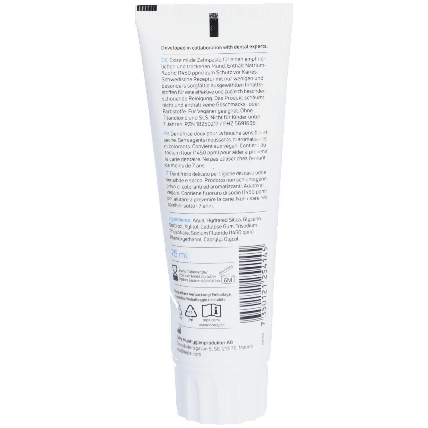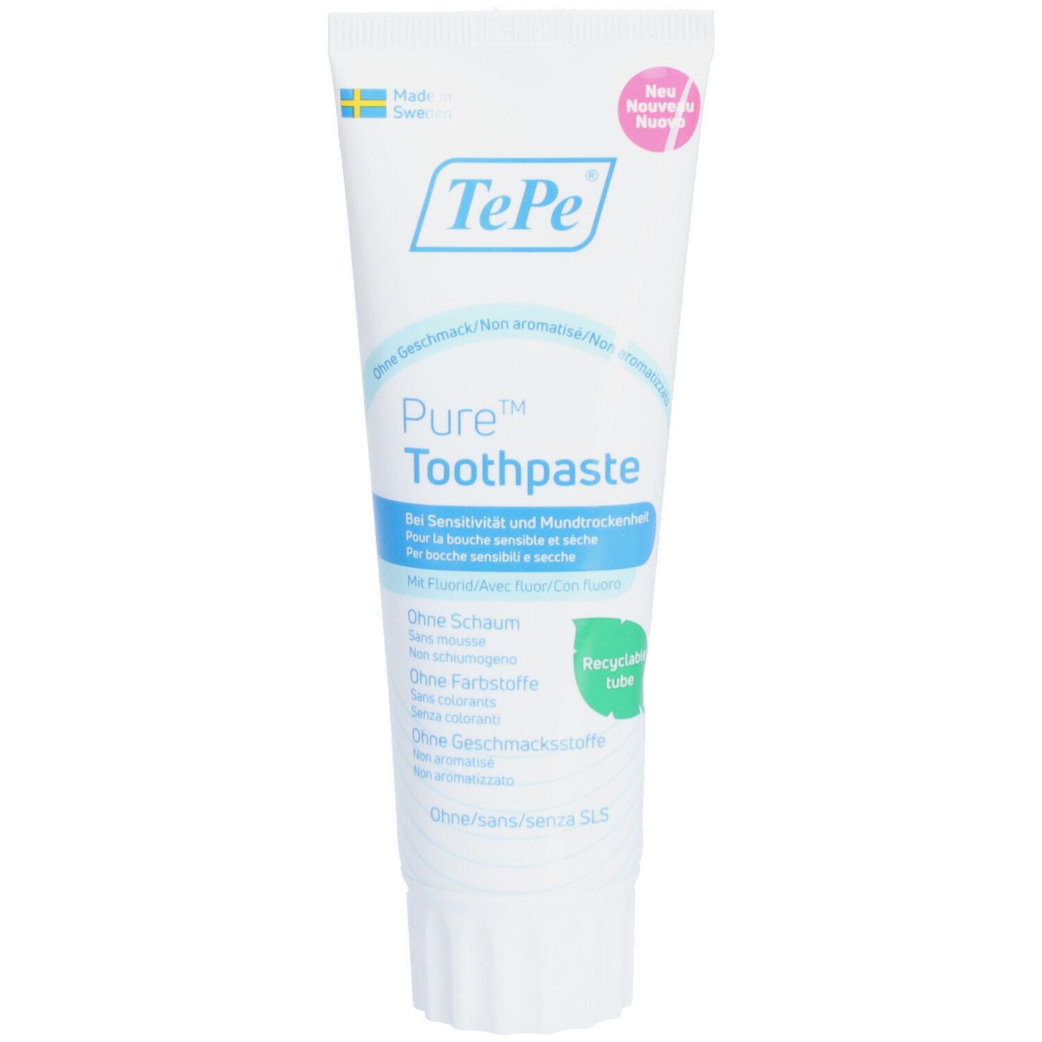 TePe Pure™ - специальная зубная паста без вкусовых добавок для людей с чувствительными деснами. Не пенится, не содержит красителей, SLS и титанового диоксида. Содержит фторид (1450 ppm) для защиты от кариеса. Подходит для веганов и детей от 7 лет. Объем 75 мл.