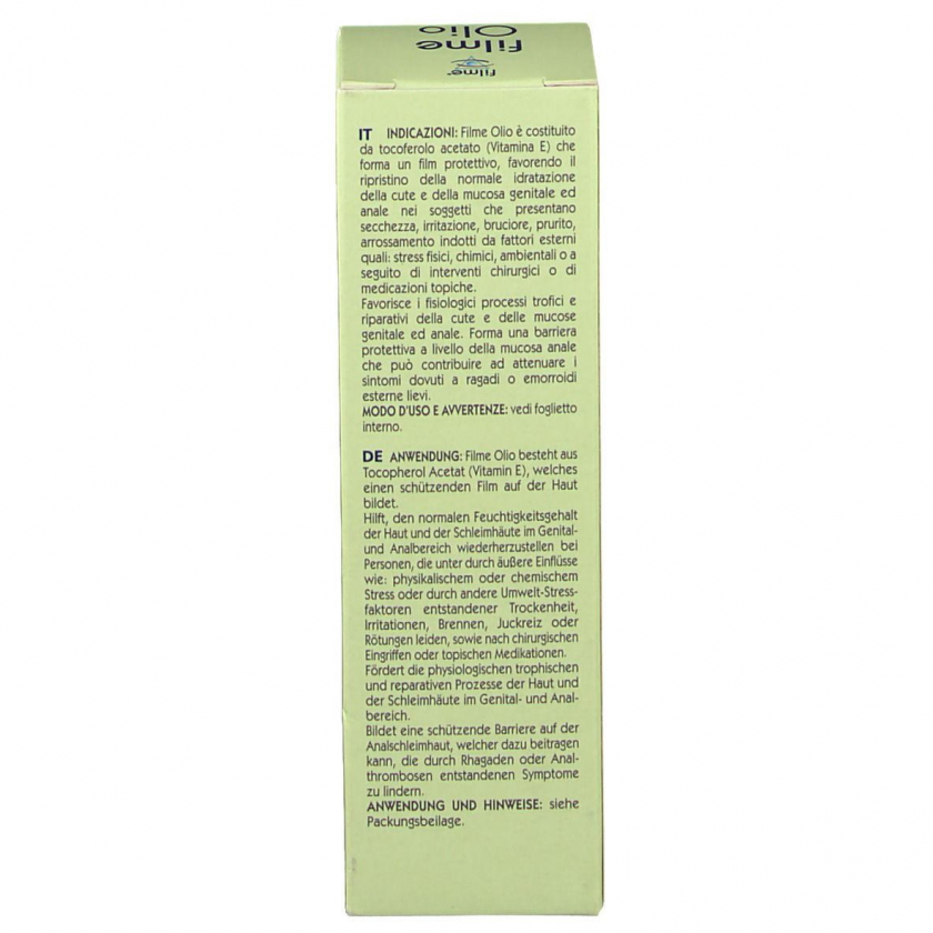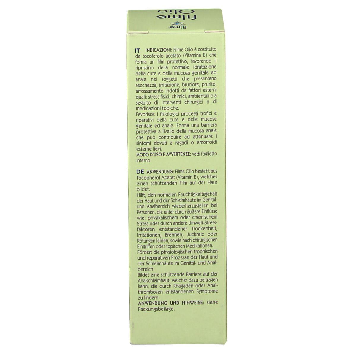 Filme® Olio - это увлажняющий защитный крем на основе витамина Е, который образует защитную пленку на коже и слизистых оболочках в генитальной и анальной области. Помогает восстановить нормальный уровень увлажнения, снимает сухость, раздражение, жжение, зуд и покраснения, вызванные внешними факторами, оперативными вмешательствами или местными медикаментами.