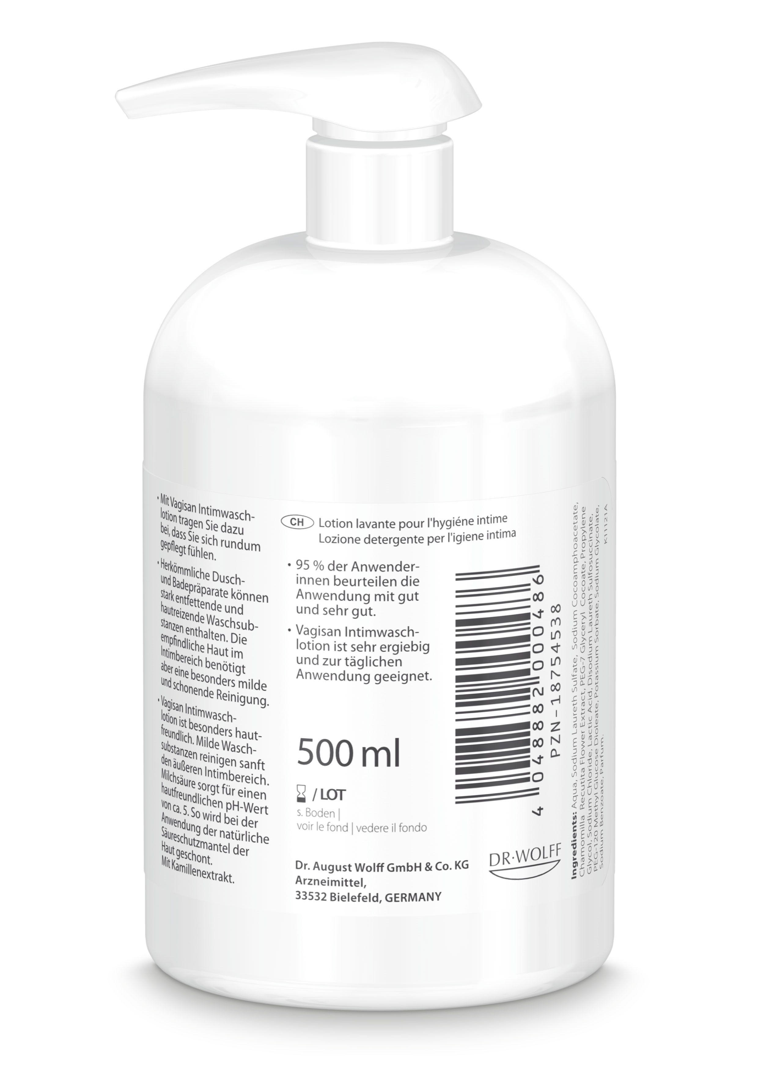 Vagisan Intimwaschlotion - нежная лосьон для интимной гигиены с молочной кислотой и экстрактом ромашки. Поддерживает естественный pH-баланс (около 5), предотвращает раздражения и инфекции, подходит для ежедневного использования, в том числе во время беременности. Объем 500 мл.