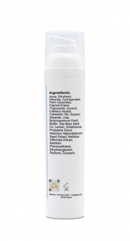 Состав: Вода, этилгексил стеарат, гидрогенизированные пальмовые глицериды, каприловый/каприновый триглицерид, глицерин, цетеариловый спирт, цетеарет-100, глицерил стеарат, мочевина, масло ши, масло семян кукурузы, ланолин, диметикон, пропиленгликоль, экстракт семян конского каштана, экстракт донника лекарственного, кумарин, аллантоин, полиаминопропил бигуанид, парфюм