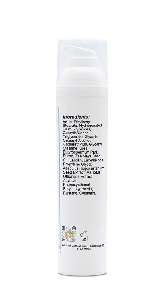 Вода, этилгексил стеарат, гидрогенизированные пальмовые глицериды, каприловый/каприновый триглицерид, глицерин, цетеариловый спирт, цетеарет-100, глицерил стеарат, мочевина, масло ши, масло семян кукурузы, ланолин, диметикон, пропиленгликоль, экстракт семян конского каштана, экстракт донника лекарственного, кумарин, аллантоин, полиаминопропил бигуанид, парфюм