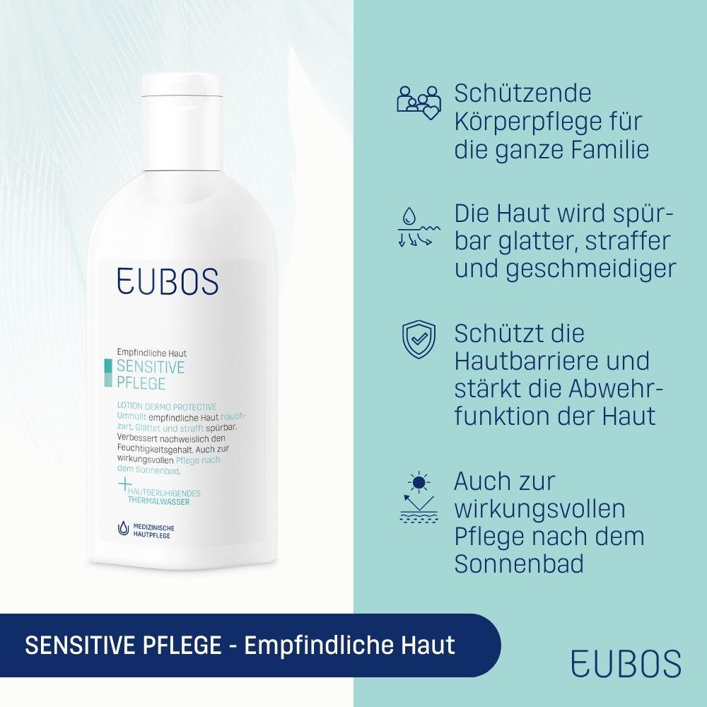EUBOS® Sensitive Lotion Dermo Protectiv - интенсивно увлажняющая и защищающая лосьон для тела для чувствительной, нормальной и сухой кожи. Содержит термальную воду, фито-активную систему, масла авокадо и макадамии. Без парабенов, ПЭГ, красителей, ланолина и минеральных масел. pH 5,5, дерматологически протестирован