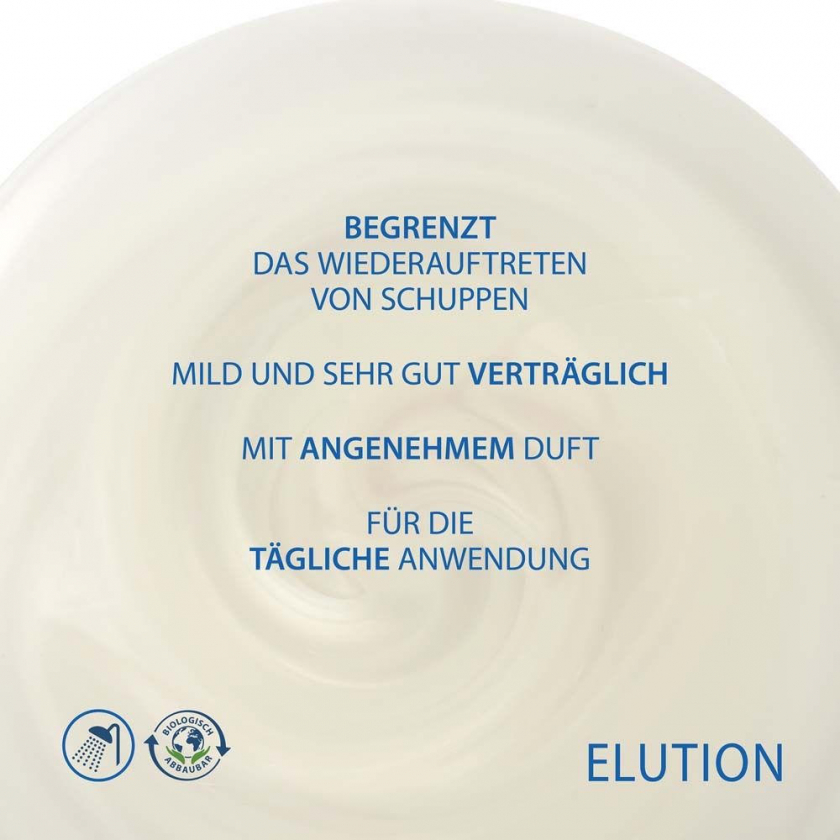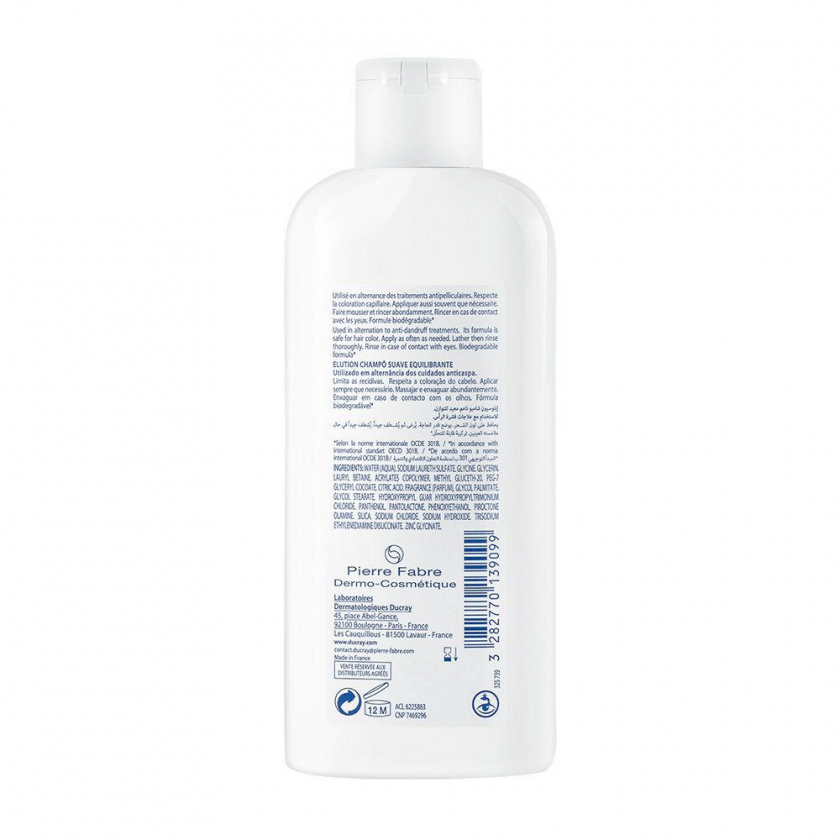 DUCRAY ELUTION - балансирующий шампунь для профилактики повторного появления перхоти. Подходит для чувствительной кожи головы после антиперхотного лечения. Обеспечивает мягкое очищение, придает волосам объем и гладкость. Рекомендован с 12 лет.