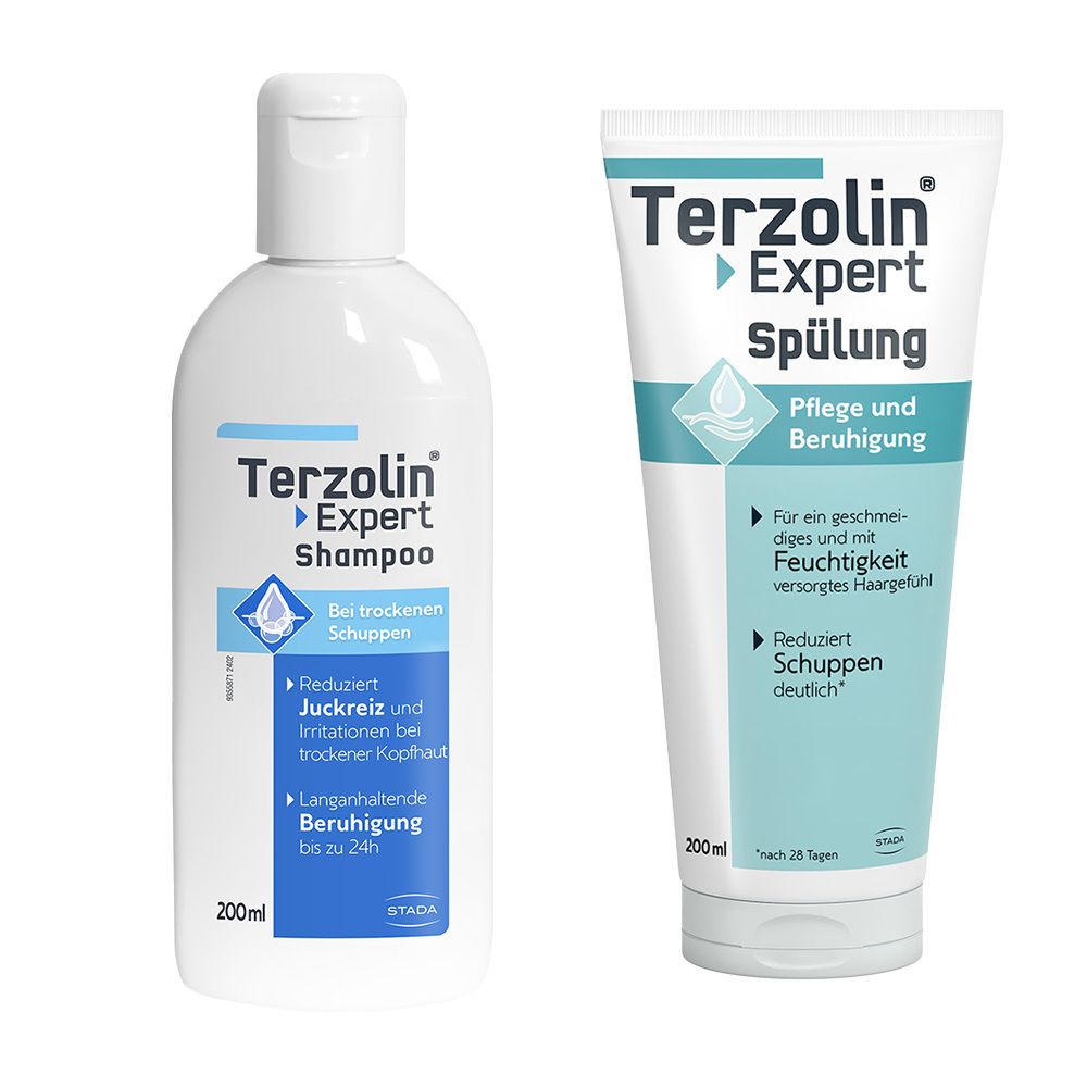 Набор Terzolin® Expert для ухода за волосами и кожей головы: шампунь против сухой перхоти 200 мл и кондиционер для защиты волос и кожи головы 200 мл. Средства содержат инновационные компоненты SymFerment® и Xpertmoist® для увлажнения, укрепления кожного барьера и уменьшения перхоти, зуда и раздражения. Подходит для ежедневного использования при сухой коже головы и склонности к экземам.