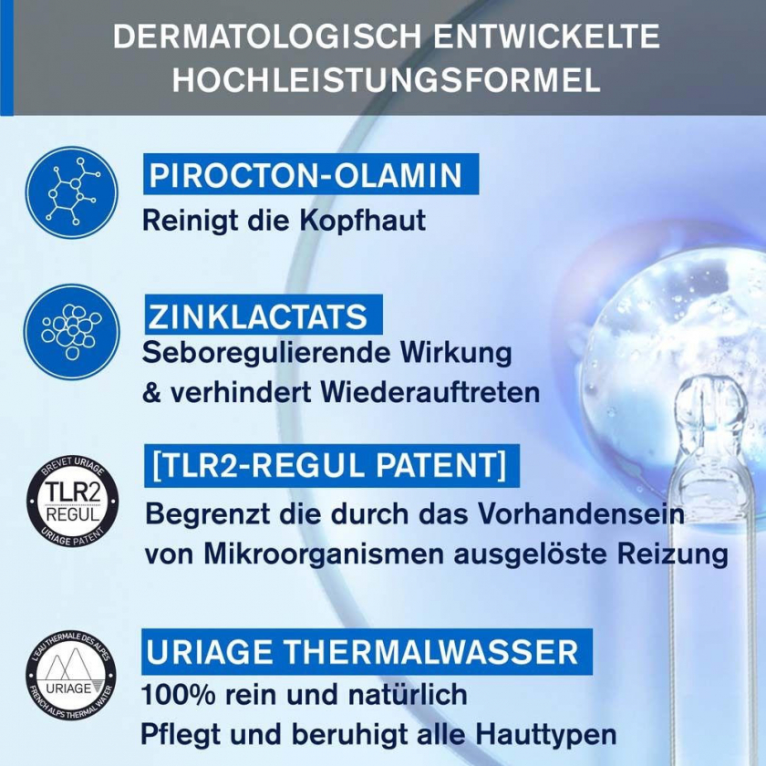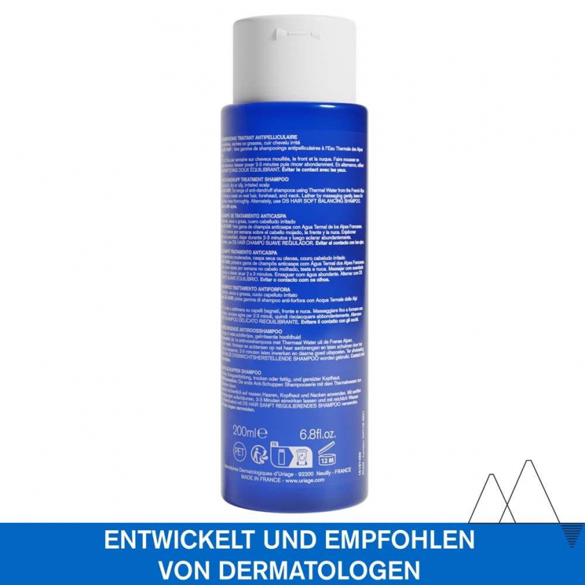 Профессиональный шампунь против перхоти URIAGE DS HAIR эффективно борется с сухой и жирной перхотью, успокаивает кожу головы и снимает зуд. Содержит термальную воду Uriage из французских Альп, пироктон оламин, салициловую кислоту и лактат цинка для комплексного ухода за волосами и кожей головы.