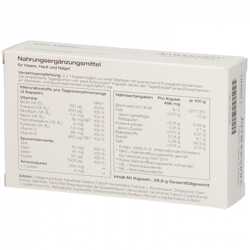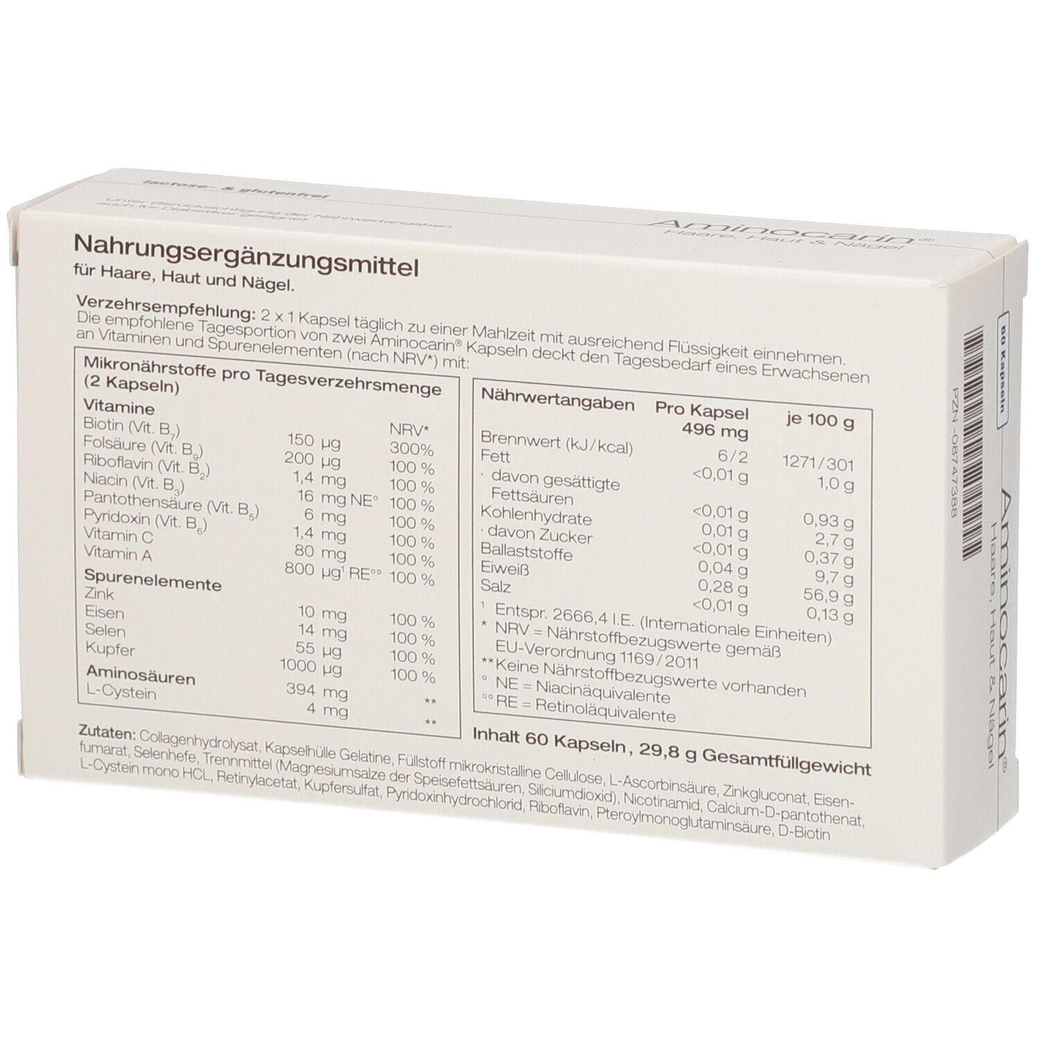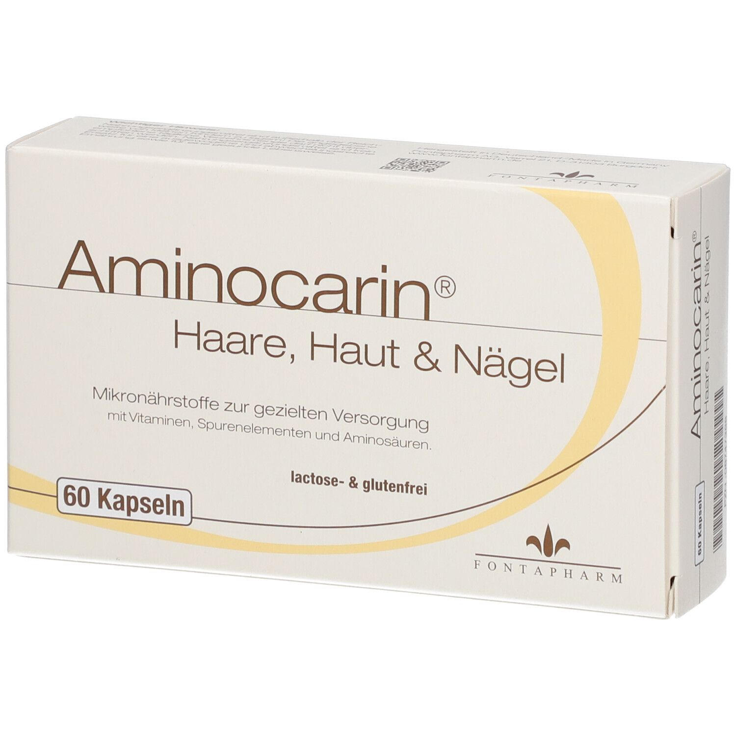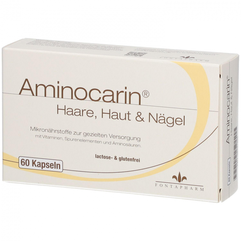 Пищевая добавка Aminocarin® в капсулах для улучшения состояния волос и ногтей. Содержит комплекс витаминов, минералов, аминокислот и коллагена. Подходит для людей с непереносимостью лактозы и глютена. Рекомендуется принимать по 2-3 капсулы в день перед едой курсом не менее 6 месяцев.