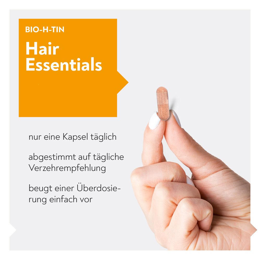 BIO-H-TIN® Hair Essentials - биологически активная добавка для укрепления и роста волос. Содержит комплекс биотина, цинка, селена, железа, меди и других микроэлементов, которые питают волосяные фолликулы и способствуют здоровому росту волос. Принимается по 1 капсуле в день, подходит для мужчин и женщин.