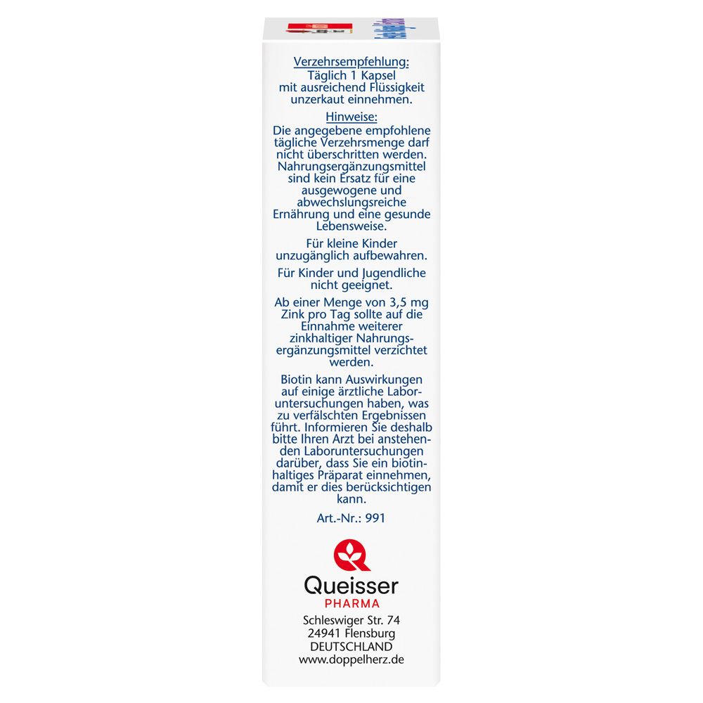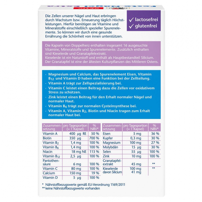 Биологически активная добавка Doppelherz aktiv Feste Nägel EXTRA содержит комплекс из 16 витаминов, минералов и микроэлементов для укрепления ногтей и поддержания здоровья кожи. Включает цинк, селен, биотин, витамины группы B, кремнезем и экстракт граната. Рекомендуется для улучшения состояния ногтей и кожи.