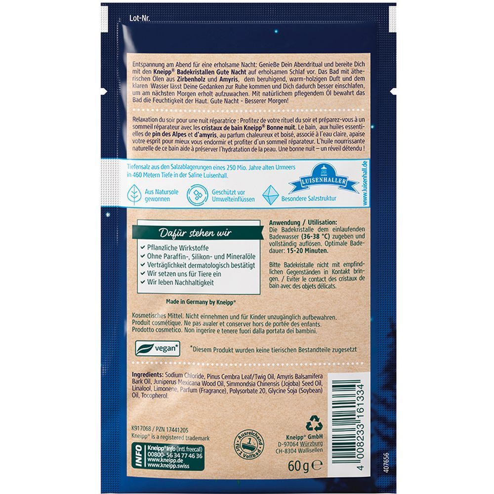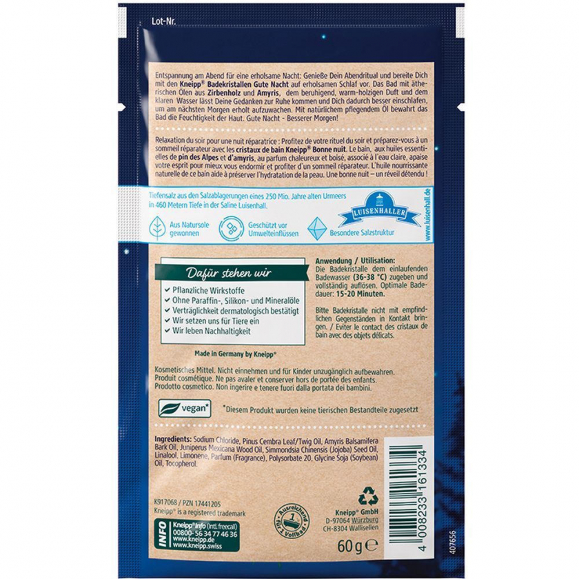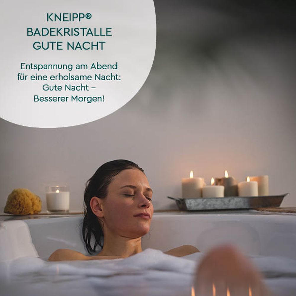 Kneipp® Badekristalle Gute Nacht - расслабляющие кристаллы для ванны с натуральными эфирными маслами для вечернего отдыха и улучшения качества сна. Содержат древнее морское соль, сохраняют влажность кожи, помогают снять напряжение и подготовиться к спокойному ночному отдыху.