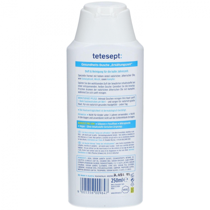 Гель для душа tetesept Erkältungszeit с эфирными маслами эвкалипта, мяты и камфорой для профилактики простуды. Обеспечивает приятный аромат и мягкое очищение кожи во время душа. Не содержит силиконов, парафинов, микропластика, подходит для веганов.