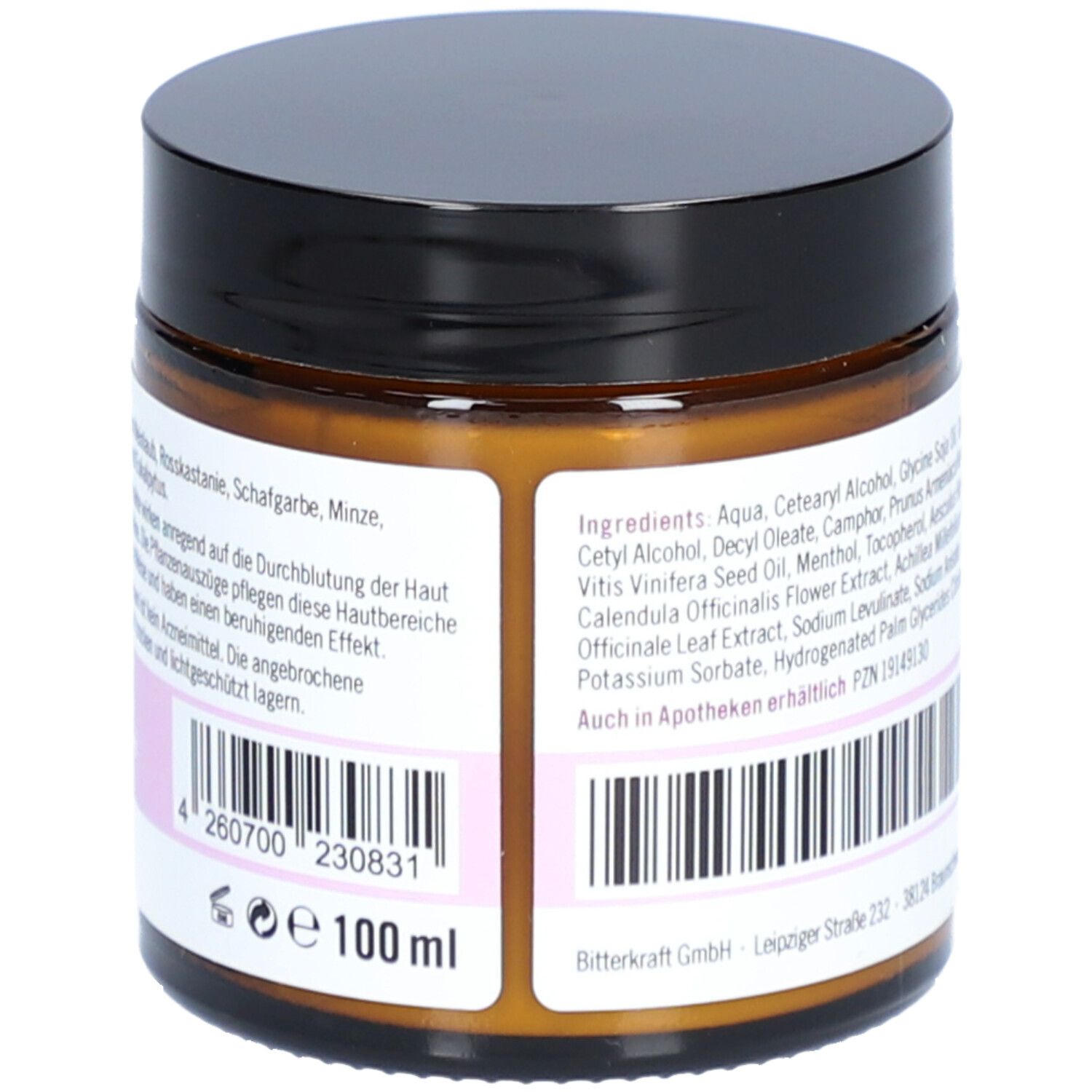 Состав: Вода, цетеариловый спирт, соевое масло, глицерин, цетил пальмитат, спирт, цетиловый спирт, децил олеат, камфора, масло косточек абрикоса, натрия цетеарил сульфат, масло виноградных косточек, ментол, токоферол, экстракт семян конского каштана, экстракт цветков календулы, экстракт цветков тысячелистника, экстракт листьев окопника, натрия левулинат, натрия анисат, лимонная кислота, натрия бензоат, калия сорбат, гидрогенизированные пальмовые глицериды цитрат