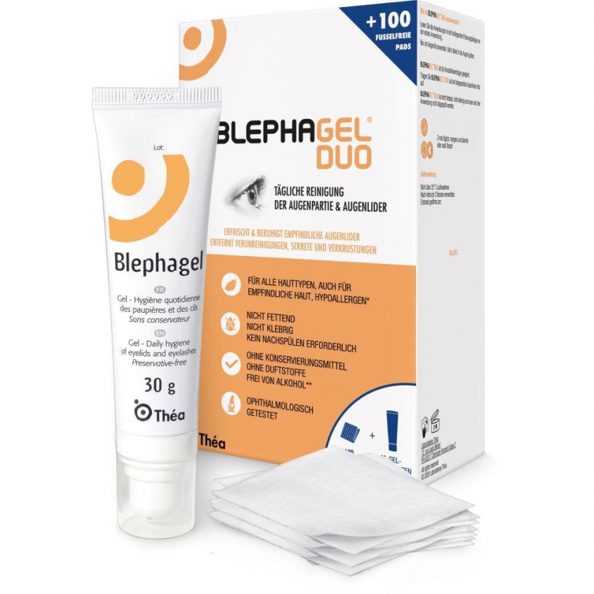 Blephagel® Duo - гипоаллергенный гель без консервантов для бережного очищения век, ресниц и краев век. Удаляет выделения, корочки и чешуйки. В комплекте 30 г геля и 100 безворсовых компрессов. Подходит для носителей контактных линз, не требует смывания водой.