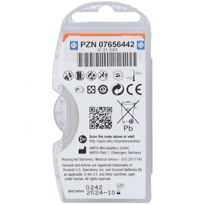 Высококачественные цинк-воздушные батарейки Duracell ACTIVAIR 13 для слуховых аппаратов. Производство в Германии, высокая производительность 310 мAh, напряжение 1,45 В, срок годности 2-3 года. Без ртути, с удобной упаковкой и длинной клейкой лентой для легкой замены.