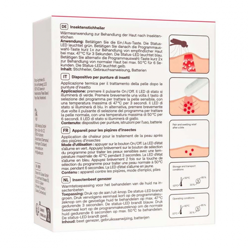 Состав: Устройство для лечения укусов насекомых с батарейным питанием, в комплекте: 1x Insektenstichheiler, 2 x 1,5 V AAA батарейки LR03