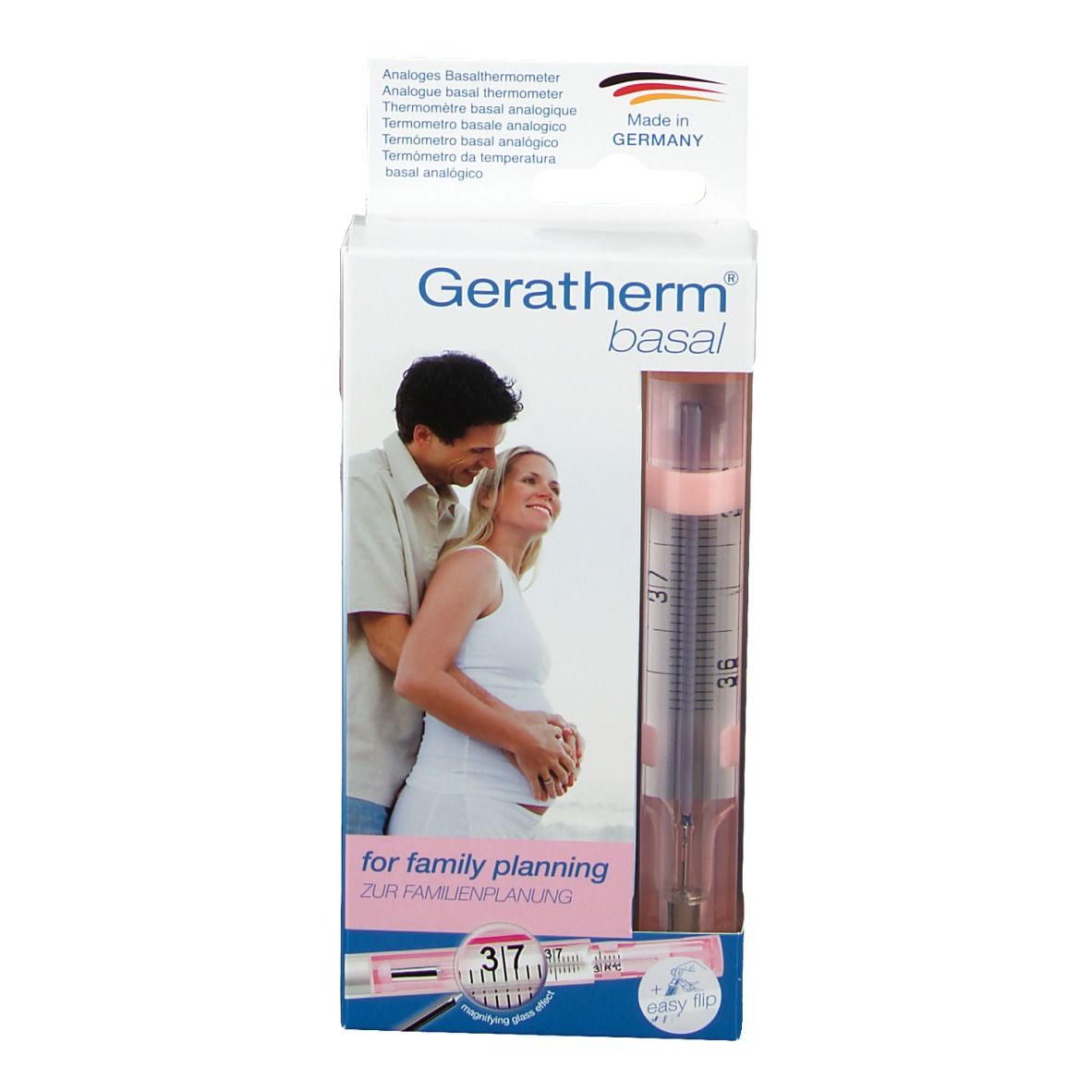 Точный базальный термометр Geratherm® basal с экологичной жидкостью Galinstan для естественного планирования семьи. Позволяет определять овуляцию и фертильные дни путем измерения утренней температуры. Имеет пожизненную гарантию точности ±0,1°C, лупу для чтения, водонепроницаем и гипоаллергенен. В комплекте таблица для записи результатов.