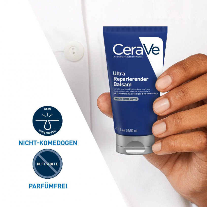 CeraVe Ultra Reparierender Balsam - защищающий и успокаивающий бальзам для сухой и грубой кожи. Содержит гиалуроновую кислоту и 3 эссенциальных церамида для быстрого восстановления защитного барьера кожи. Без отдушек и алкоголя, подходит для всей семьи, включая младенцев от 1 месяца.