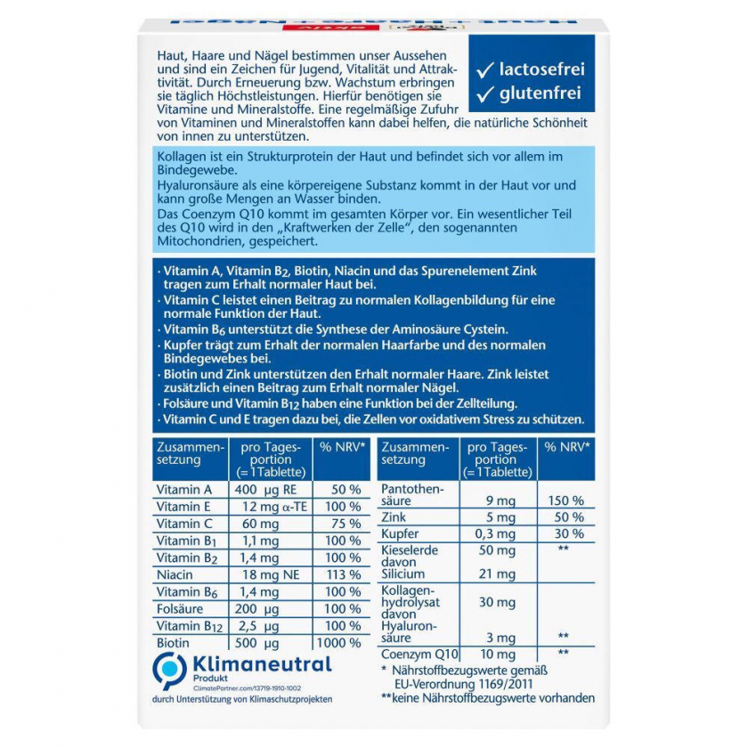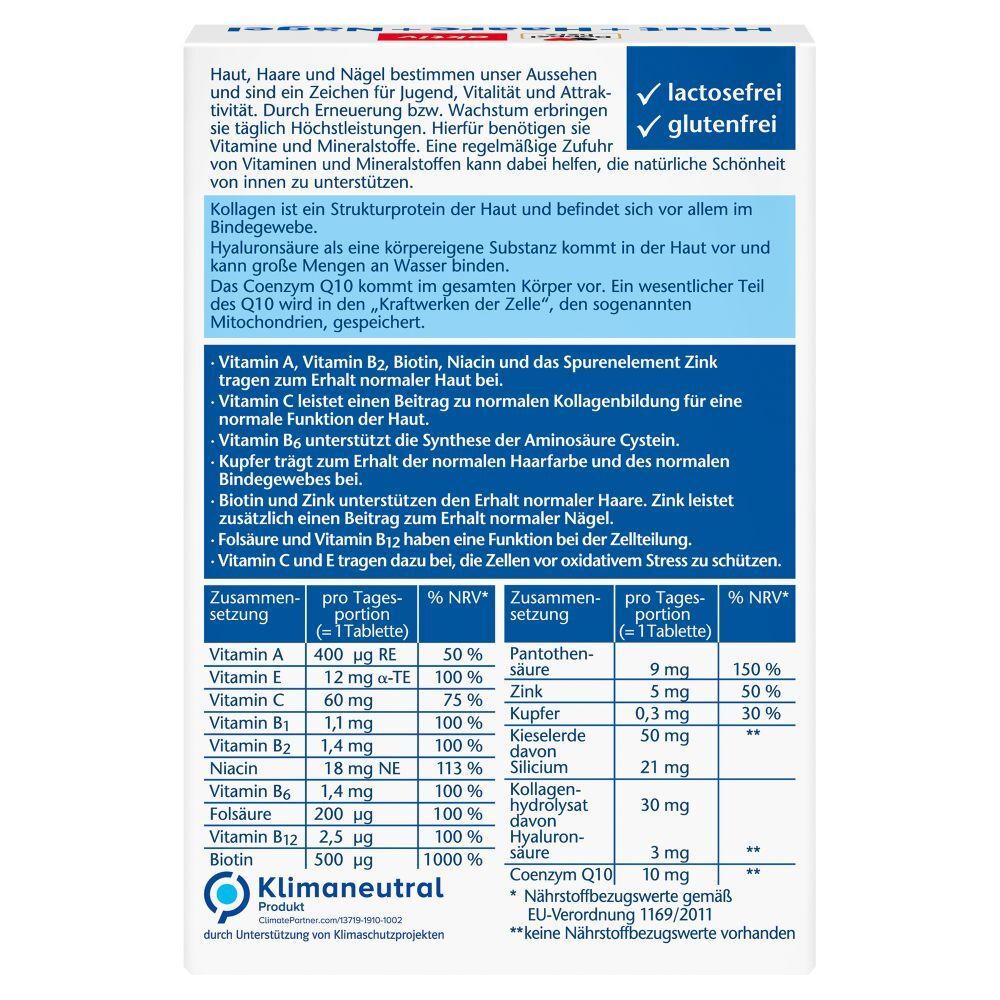 Состав: Витамины (A, C, E, B1, B2, B6, B12, ниацин, фолиевая кислота, биотин, пантотеновая кислота), минералы (цинк, медь, кремний), коллагеновый гидролизат с гиалуроновой кислотой, коэнзим Q10, экстракт граната, микрокристаллическая целлюлоза, вспомогательные вещества