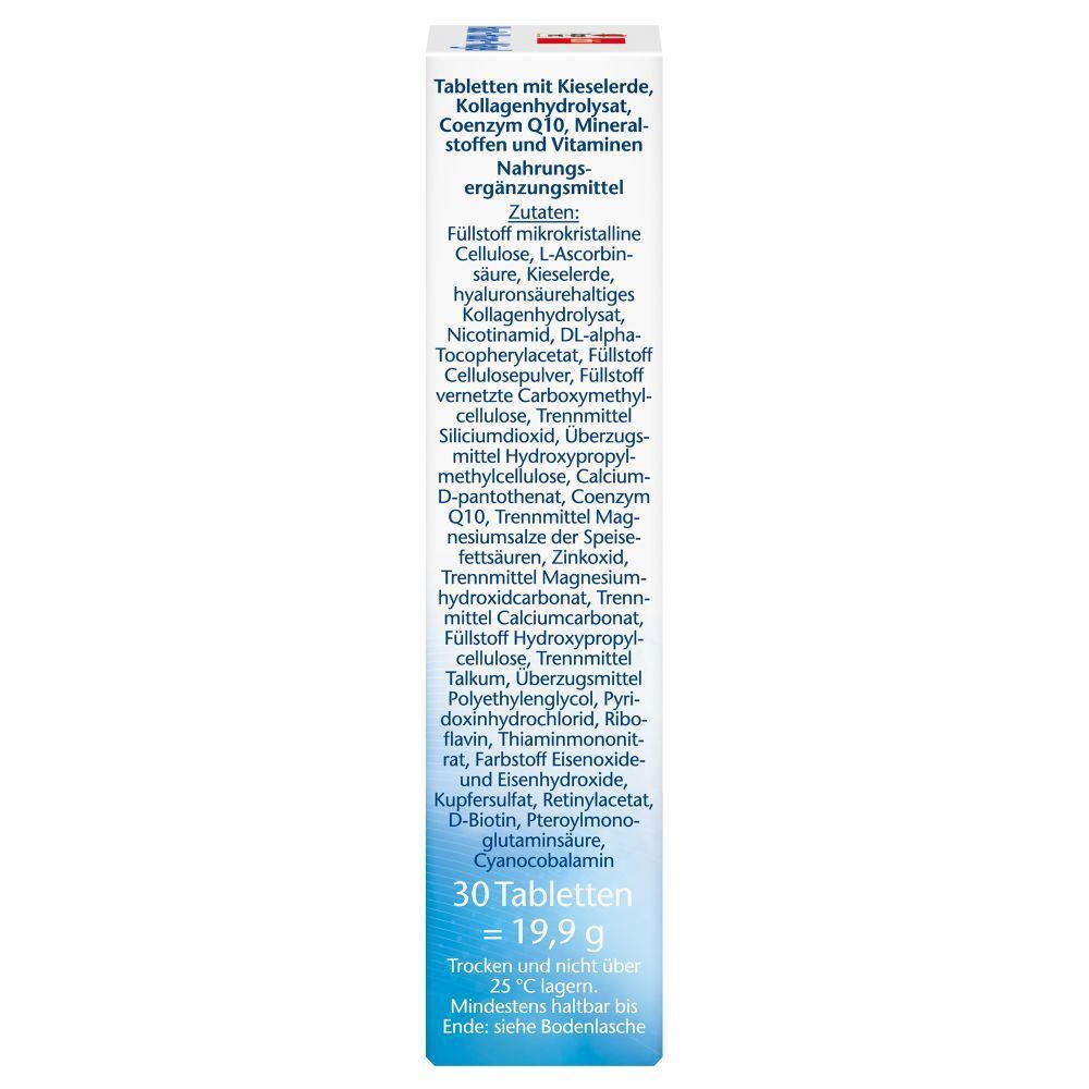 Витамины (A, C, E, B1, B2, B6, B12, ниацин, фолиевая кислота, биотин, пантотеновая кислота), минералы (цинк, медь, кремний), коллагеновый гидролизат с гиалуроновой кислотой, коэнзим Q10, экстракт граната, микрокристаллическая целлюлоза, вспомогательные вещества
