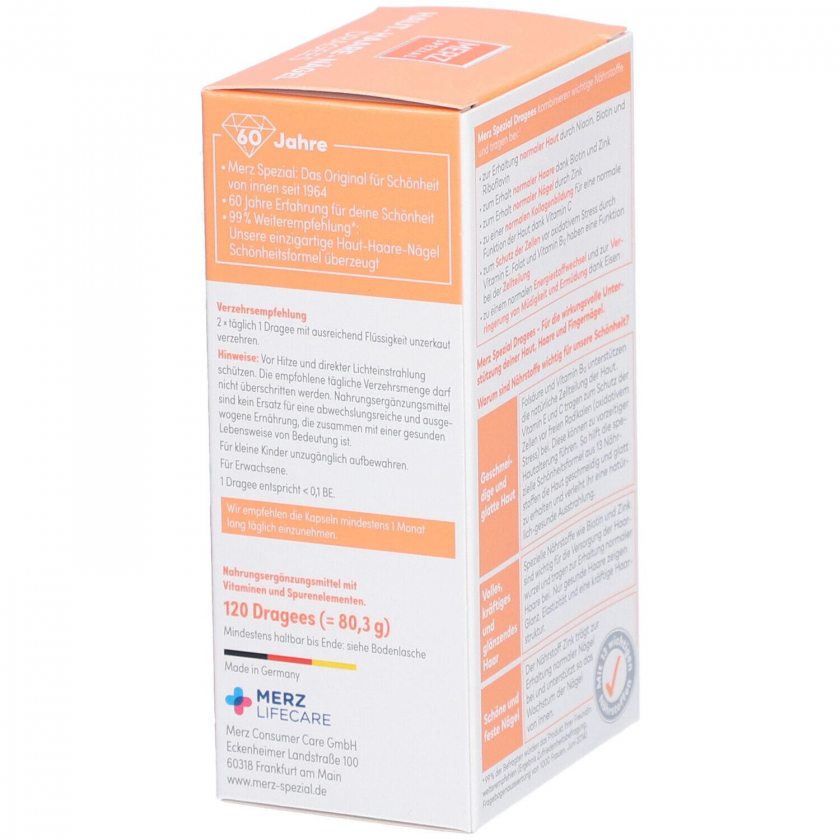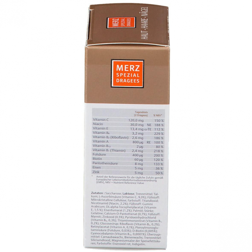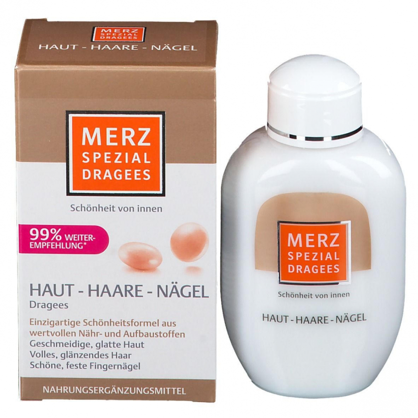Merz Spezial Dragees - пищевая добавка с 14 витаминами и минералами для поддержания здоровья кожи, волос и ногтей. Содержит витамины A, C, E, группы B, биотин, цинк, железо и другие важные питательные вещества. Рекомендуется принимать по 1 драже утром и вечером в течение 8-12 недель для достижения видимого эффекта.