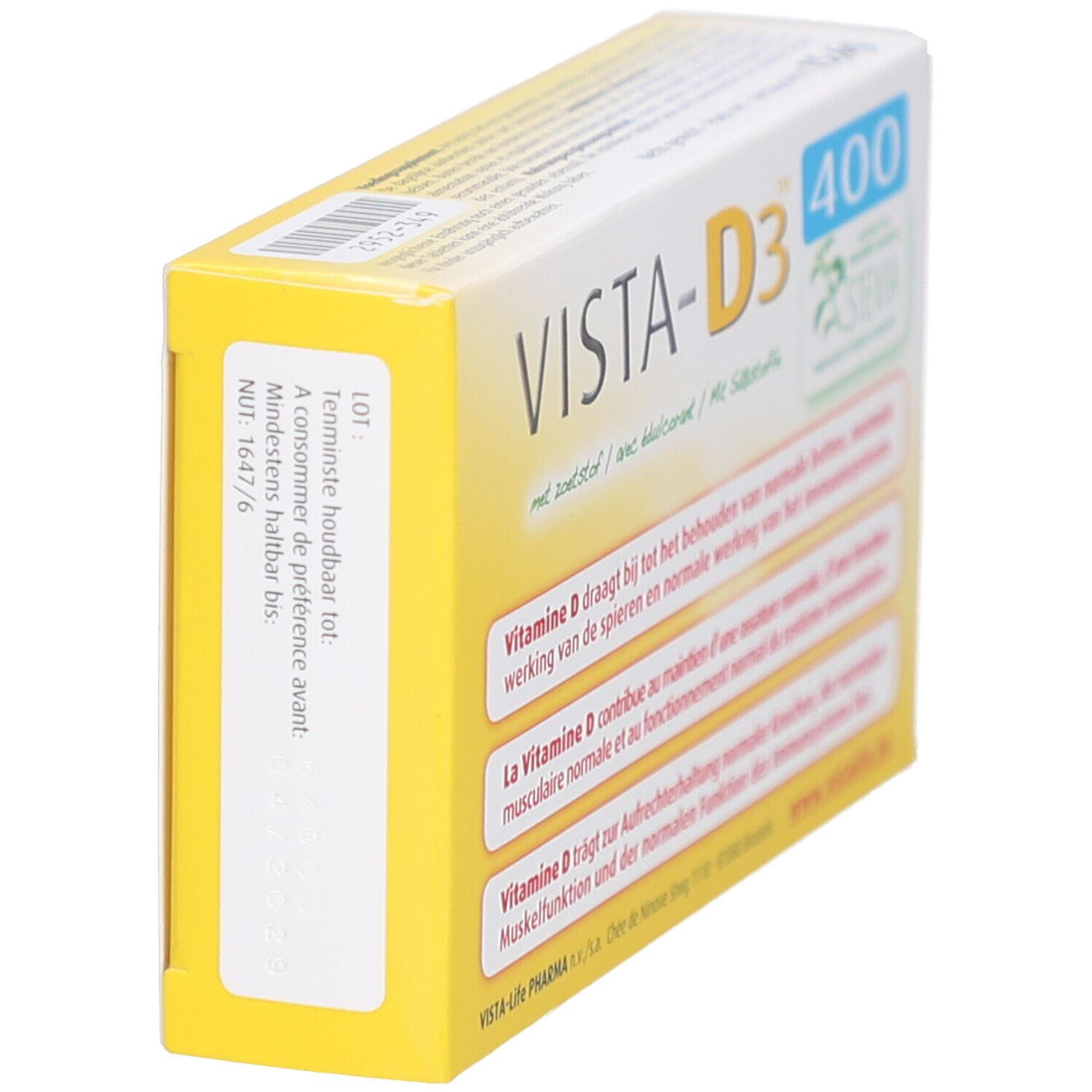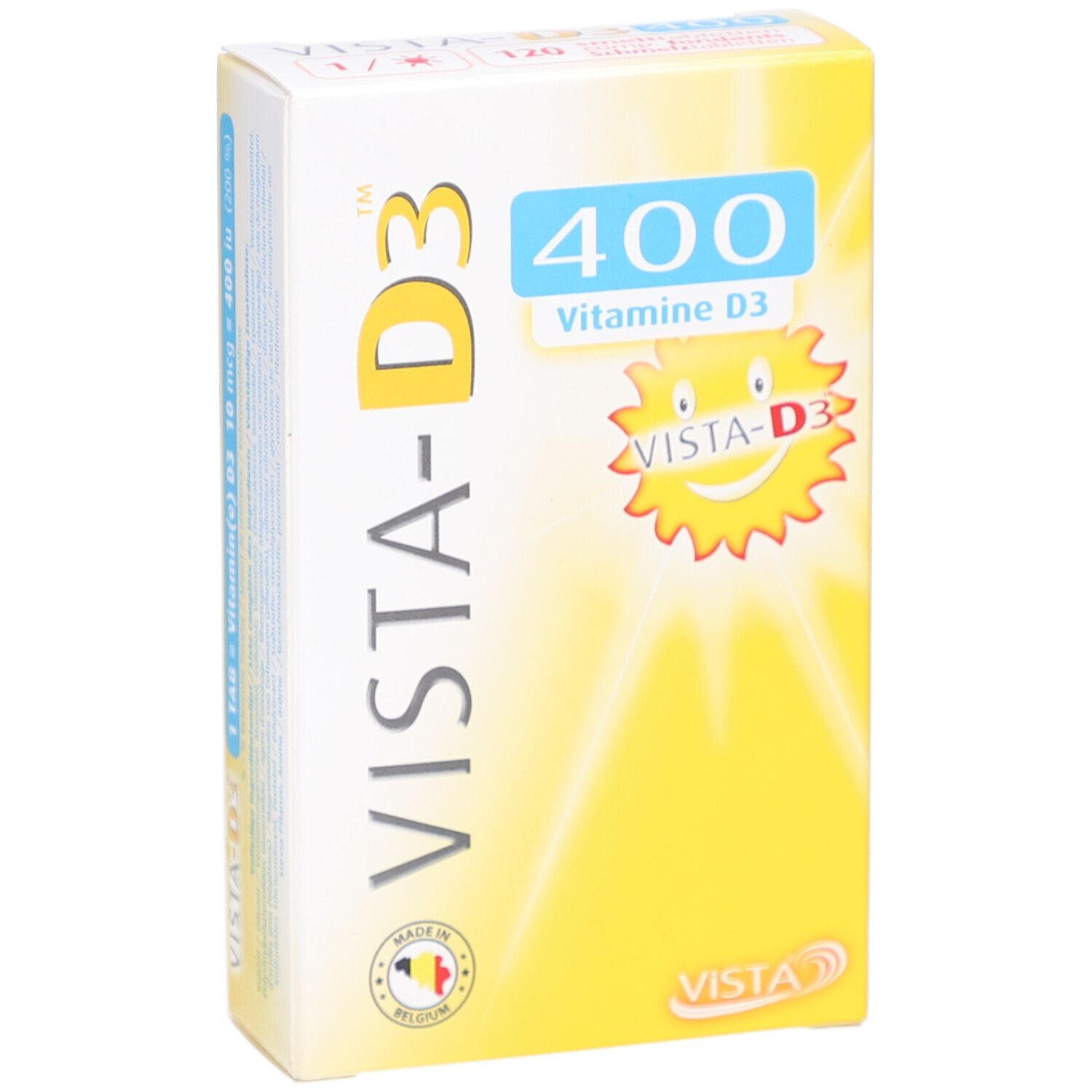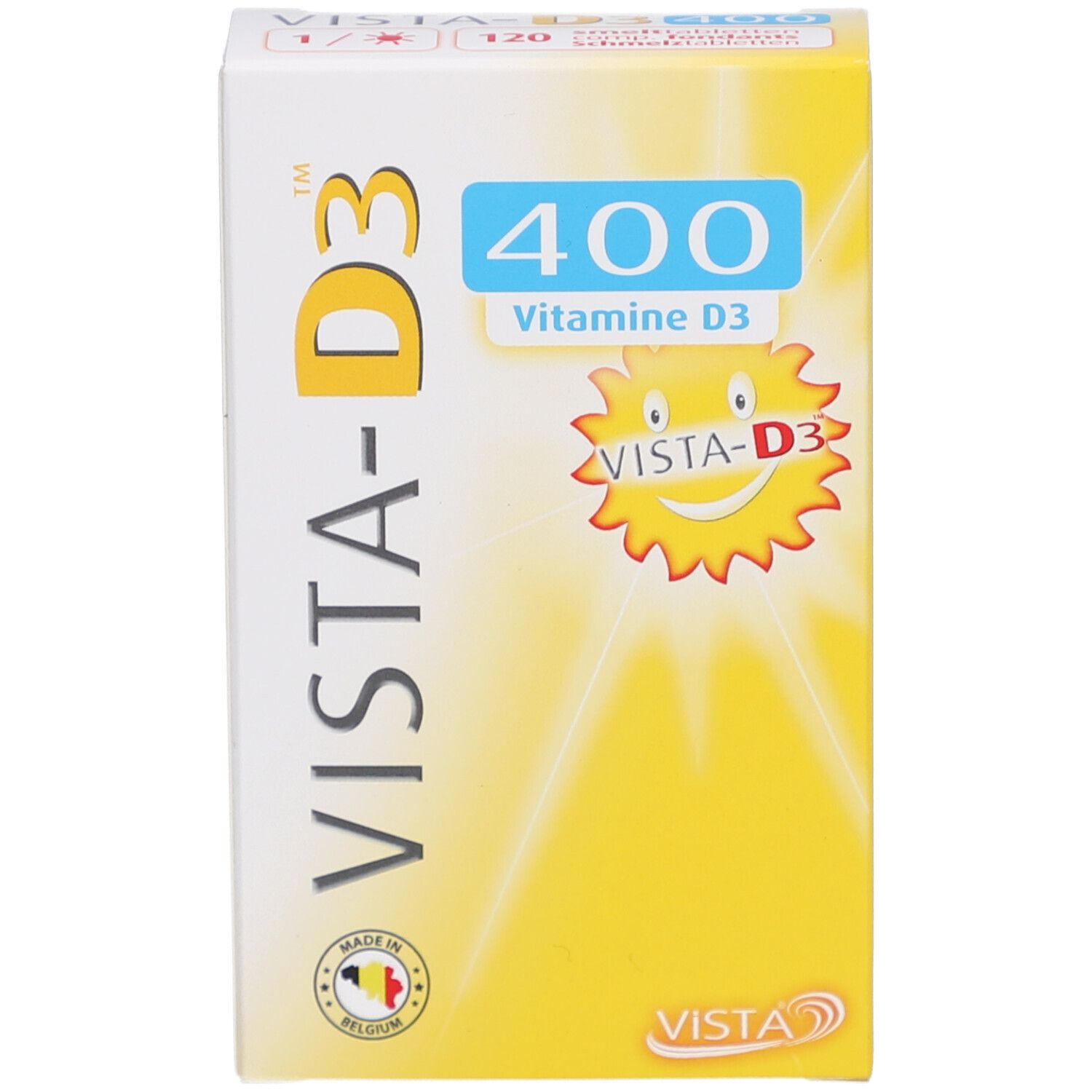 VISTA-D3 400 Junior - детская пищевая добавка с витамином D3 в форме рассасывающихся таблеток со вкусом мяты. Содержит 10 мкг витамина D3 в каждой таблетке, упаковка 120 таблеток. Произведено в Бельгии, предназначено для детей.