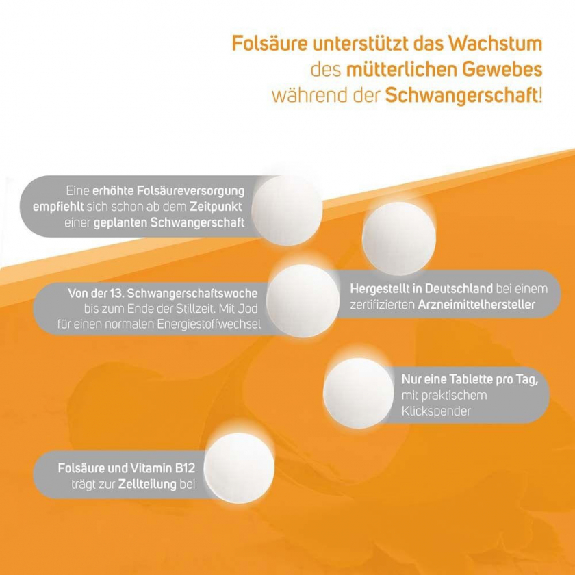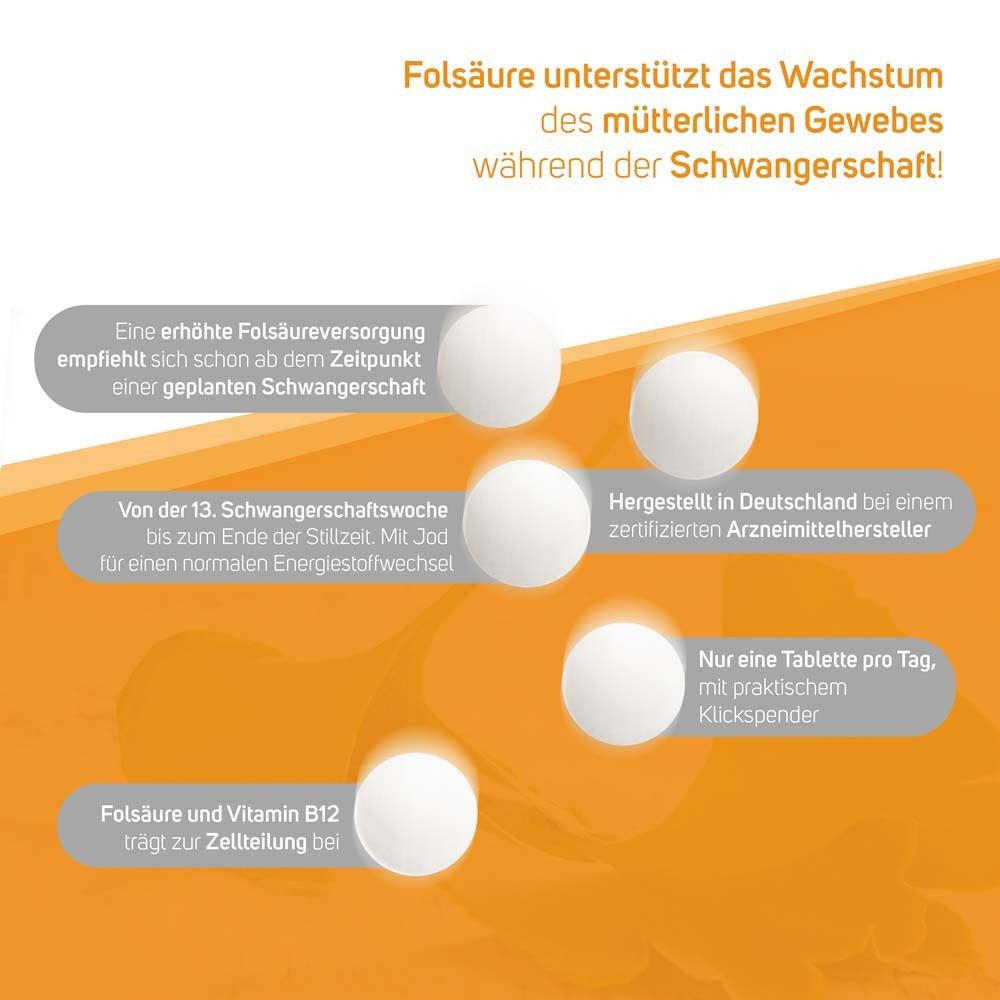 Avitale Folsäure 400 Plus - пищевая добавка с фолиевой кислотой, йодом и витамином B12, специально разработанная для женщин с 13-й недели беременности до конца периода грудного вскармливания. Содержит оптимальную дозировку необходимых нутриентов для поддержания здоровья матери и ребенка.