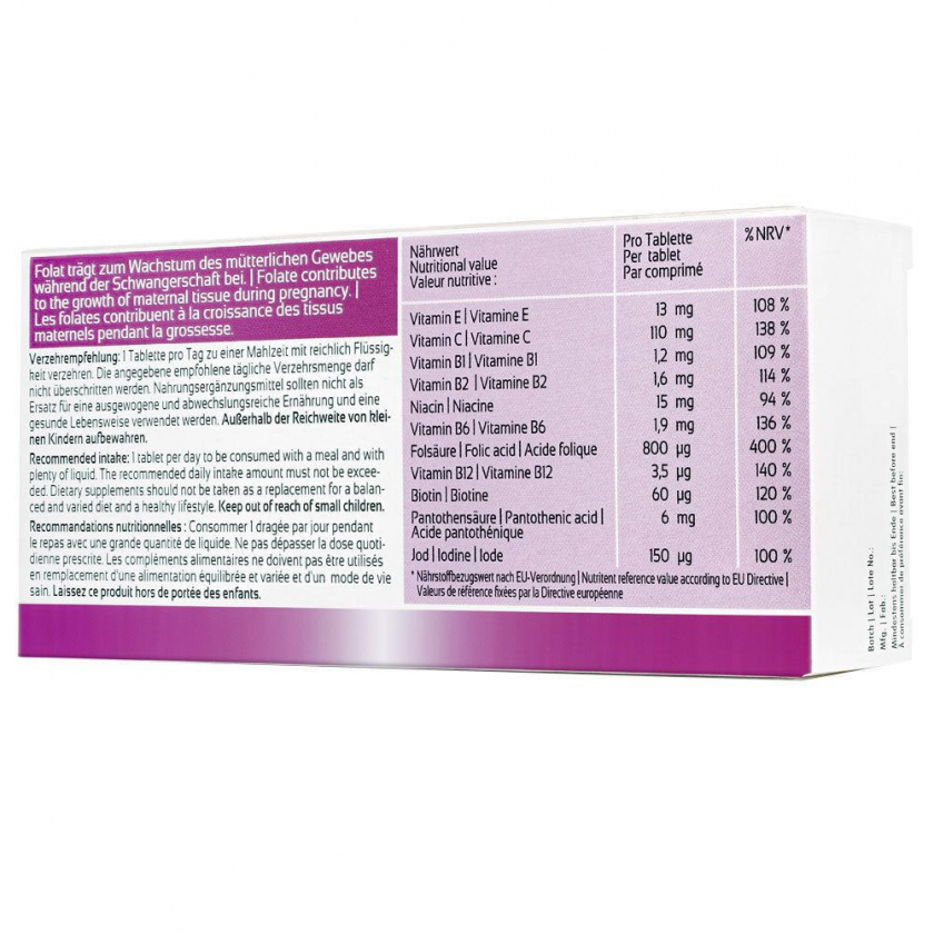 Состав: L-аскорбиновая кислота (витамин C), наполнитель фосфат кальция, наполнитель микрокристаллическая целлюлоза, DL-альфа-токоферола ацетат, наполнитель модифицированный крахмал, покрытие гидроксипропилметилцеллюлоза, никотинамид, разделитель диоксид кремния, увлажнитель глицерин, кальция-D-пантотенат, наполнитель маннит, покрытие тальк, наполнитель порошковая целлюлоза, пиридоксина гидрохлорид (витамин B6), разделитель соли магния пищевых жирных кислот, разделитель стеариновая кислота, тиамина гидрохлорид (витамин B1), рибофлавин (витамин B2), краситель, птероилмоноглутаминовая кислота, покрытие полиэтиленгликоль, йодид калия, D-биотин (витамин H), цианокобаламин (витамин B12)