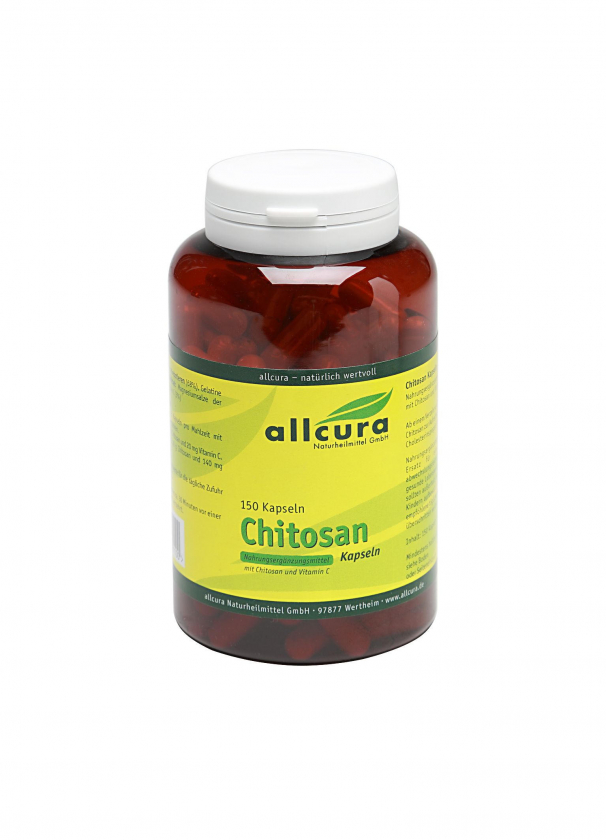 Биологически активная добавка Allcura Chitosan Kapseln с хитозаном и витамином C для поддержания нормального уровня холестерина в крови. Прием 3 г хитозан в день способствует поддержанию нормального холестерина. В упаковке 150 капсул.