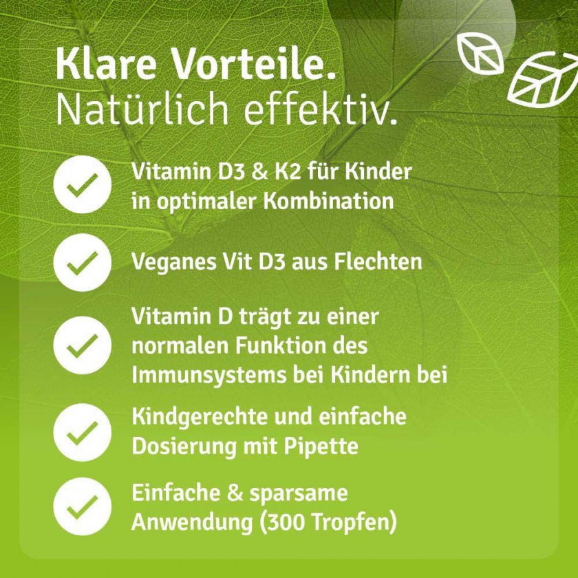 Витаминная добавка Casida® Vitamin D3 + K2 Kinder vegan - специально для детей от 4 лет. Содержит 500 МЕ витамина D3 из лишайников и 25 мкг витамина K2 в удобной форме капель. Веганский продукт без лактозы, глютена и добавок, произведен в Германии.