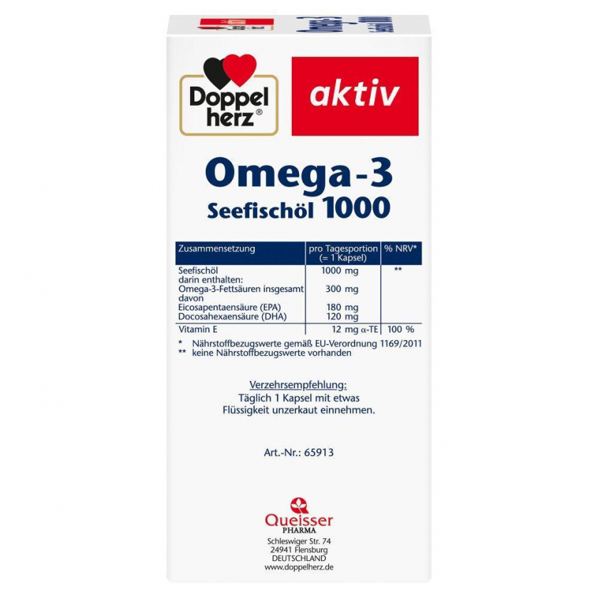 Пищевая добавка Doppelherz Omega-3 Seefischöl 1000 с высоким содержанием омега-3 жирных кислот (EPA и DHA) для поддержания нормальной функции сердца. Каждая капсула содержит 1000 мг рыбьего жира, 300 мг омега-3 кислот и витамин E. Рекомендуется принимать по 1 капсуле в день для восполнения дефицита омега-3 в рационе.