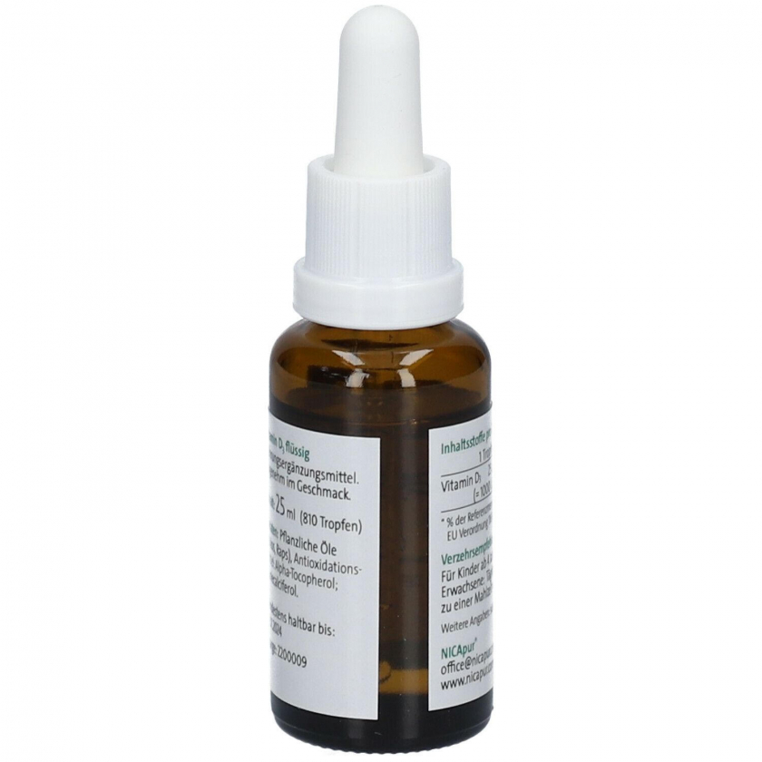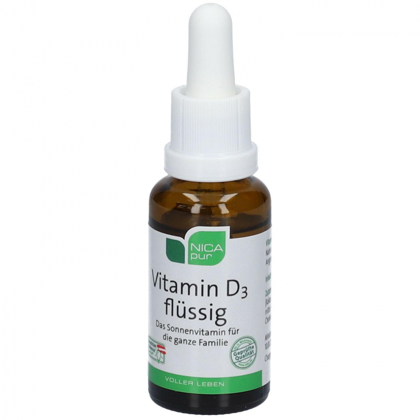 Жидкий витамин D3 NICA pur - высококачественная добавка для всей семьи. Содержит 1000 МЕ витамина D3 в одной капле на основе растительных масел. Поддерживает иммунную систему, здоровье костей и мышц. Без фруктозы, глютена и лактозы. Удобная жидкая форма для легкого дозирования.