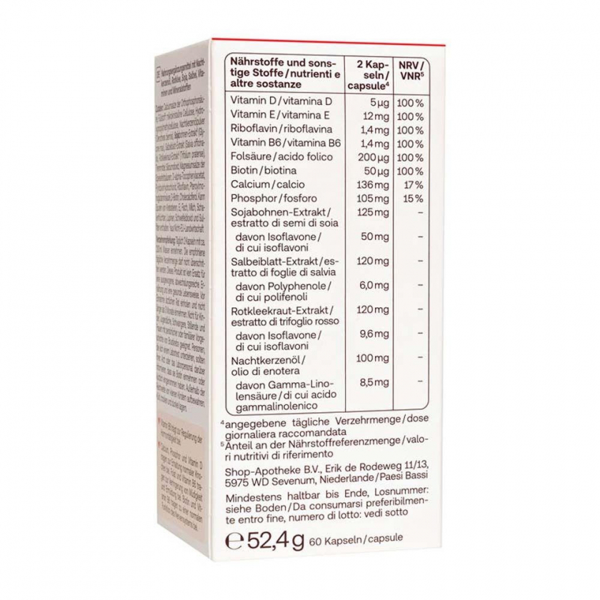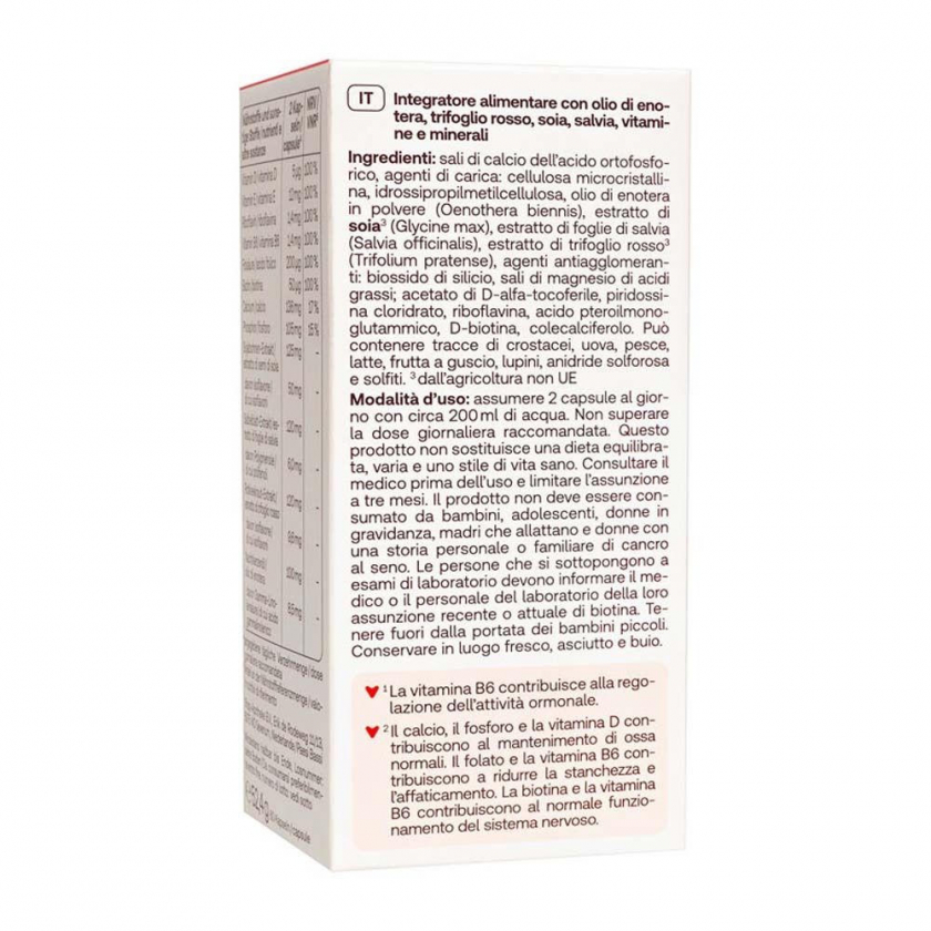 Состав: Соли кальция ортофосфорной кислоты, наполнитель: микрокристаллическая целлюлоза, гидроксипропилметилцеллюлоза, порошок масла примулы вечерней (Oenothera biennis), экстракт соевых бобов (Glycine max), экстракт листьев шалфея (Salvia officinalis), экстракт травы красного клевера (Trifolium pratense), разделитель: диоксид кремния, соли магния пищевых жирных кислот; D-альфа-токоферола ацетат, гидрохлорид пиридоксина, рибофлавин, птероилмоноглутаминовая кислота, D-биотин, холекальциферол. Содержит витамины D, E, B2, B6, фолиевую кислоту, биотин, кальций, фосфор, изофлавоны, полифенолы, гамма-линоленовую кислоту