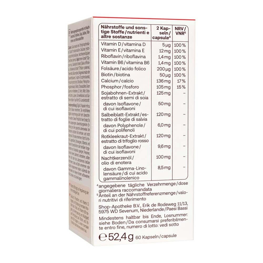 Область применения: Поддержка женского здоровья в период менопаузы, уменьшение симптомов климакса (приливы, ночная потливость, усталость, перепады настроения), поддержка костной системы и нервной системы
