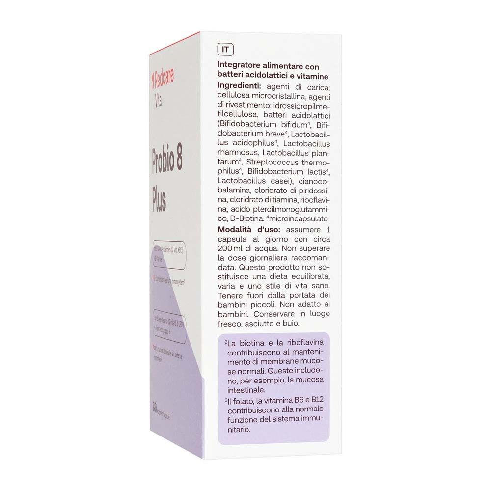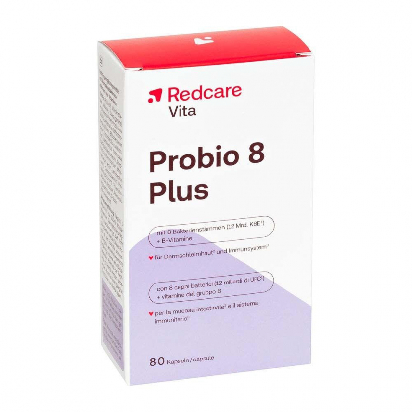 Redcare Probio 8 Plus - высокодозированный пробиотик с 8 штаммами молочнокислых бактерий (более 12 миллиардов микроорганизмов) и комплексом витаминов группы B. Поддерживает здоровье пищеварительной системы, нормальную функцию иммунитета и сохранение слизистых оболочек. Упаковка содержит 80 капсул для курса приема 2-3 месяца.