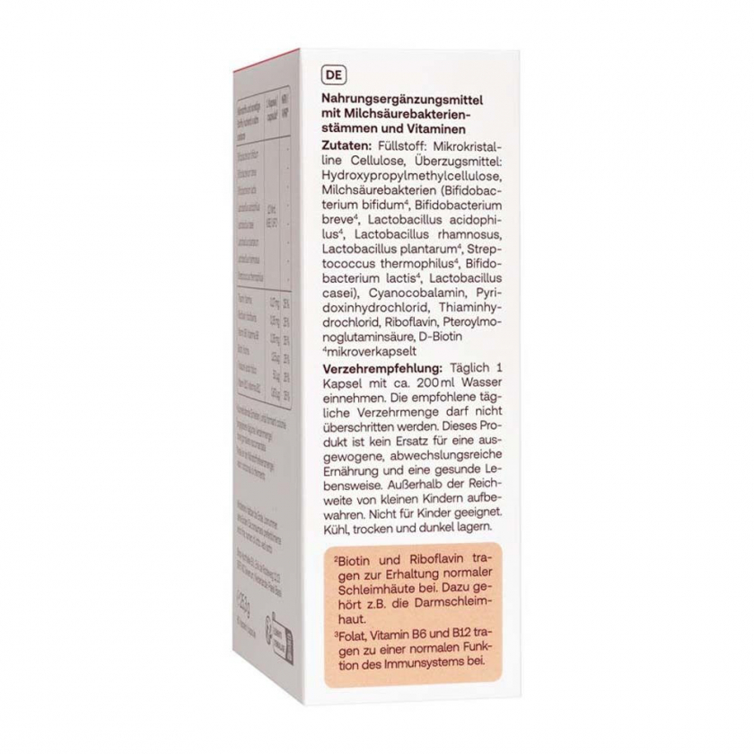 Состав: Филлматериал: Микрокристаллическая целлюлоза, оболочка: Гидроксипропилметилцеллюлоза, молочнокислые бактерии (Bifidobacterium bifidum1, Bifidobacterium breve1, Lactobacillus acidophilus1, Lactobacillus rhamnosus, Lactobacillus plantarum1, Streptococcus thermophilus1, Bifidobacterium lactis1, Lactobacillus casei), цианокобаламин, пиридоксин гидрохлорид, тиамин гидрохлорид, рибофлавин, фолиевая кислота, D-биотин – частично микрокапсулированные бактерии.