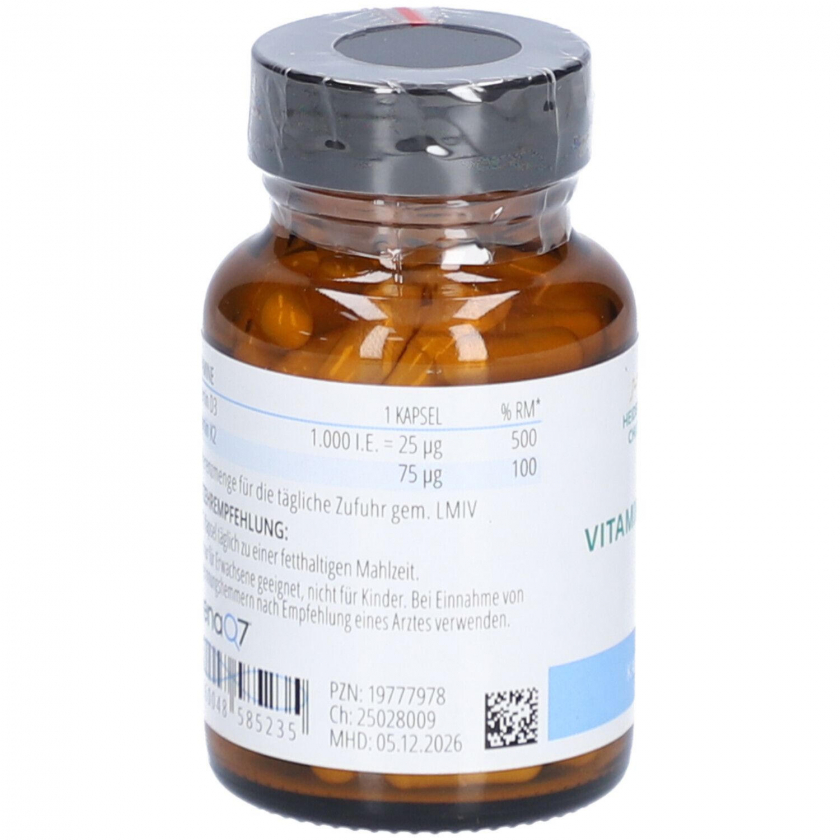 Высокодозированная пищевая добавка с витаминами D3 и K2 для взрослых. Содержит 25 мкг витамина D3 и 75 мкг витамина K2 в каждой капсуле. Применяется по рекомендации врача для профилактики и лечения дефицита витамина D. Производство Германия.