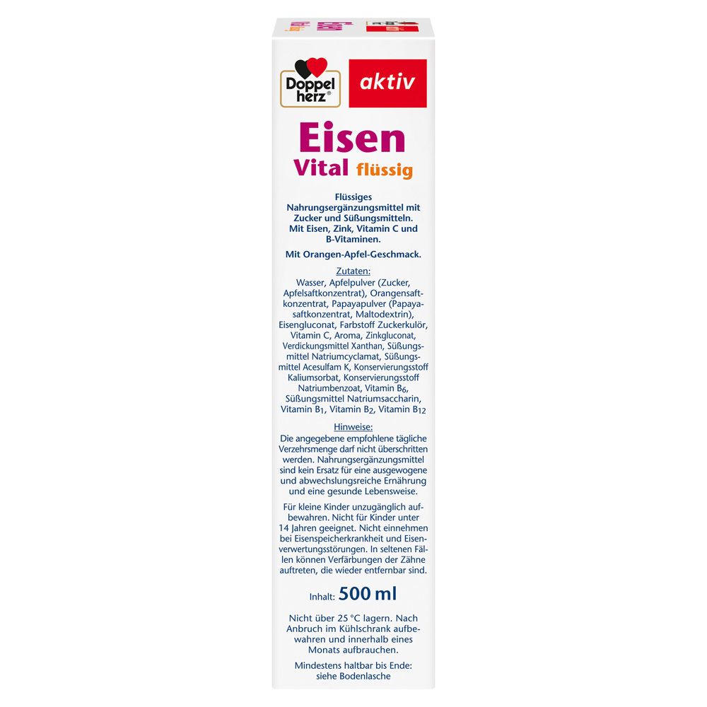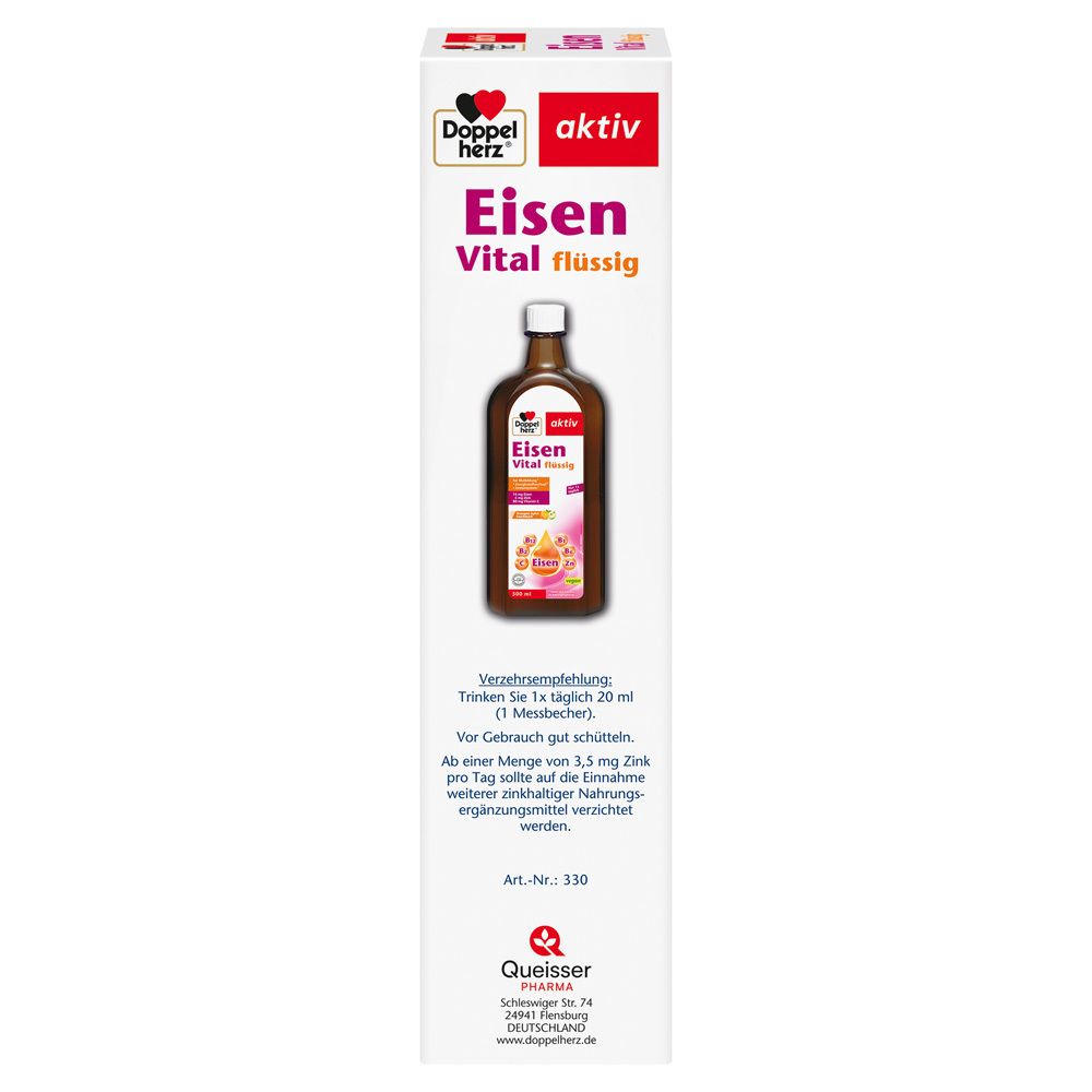 Жидкая пищевая добавка Doppelherz Eisen Vital с железом, цинком, витамином C и витаминами группы B для поддержки кроветворения, иммунной системы и энергетического обмена. Подходит для взрослых при повышенной потребности в железе.